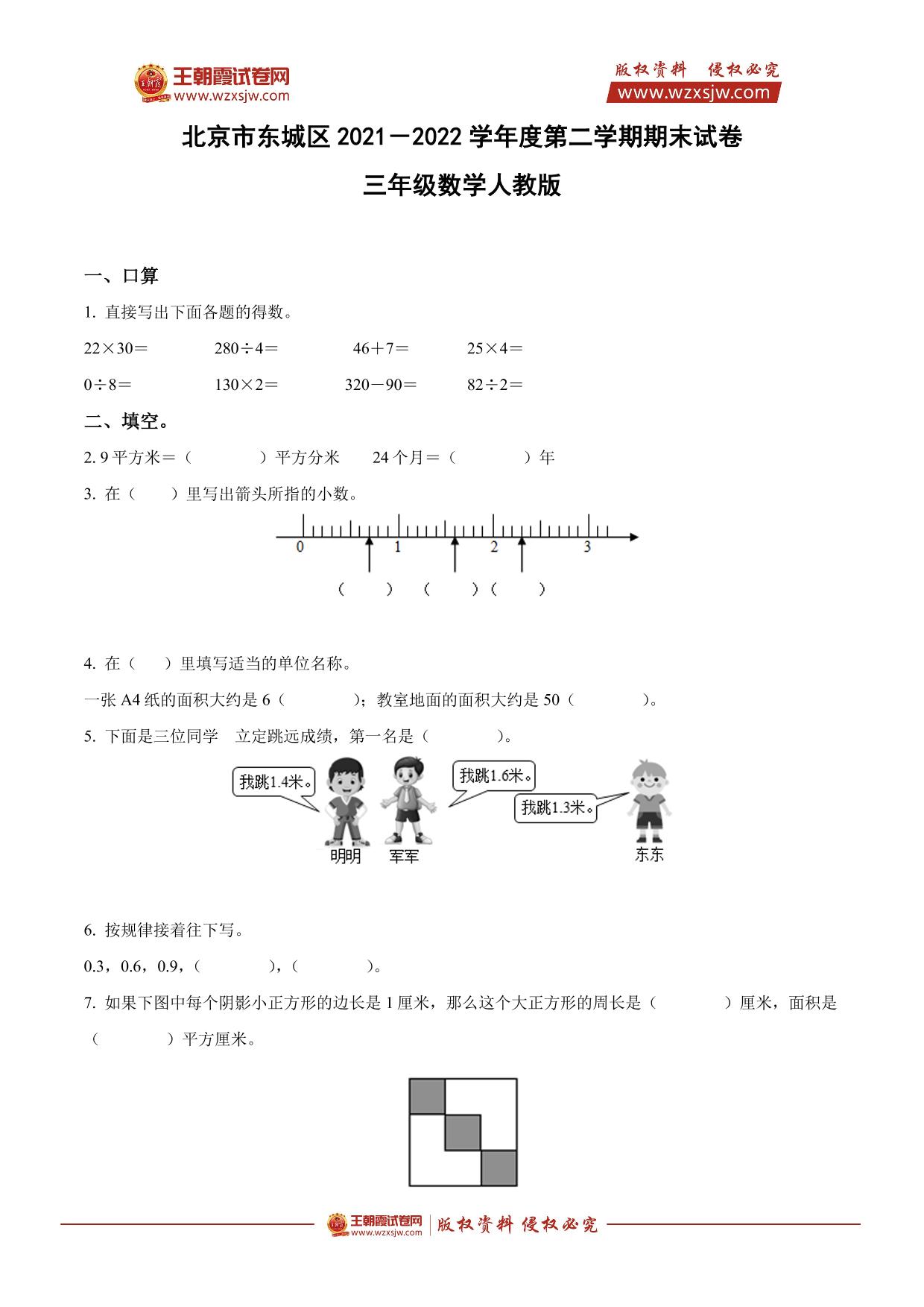 北京市东城区2021-2022学年度第二学期期末试卷三年级数学(人教版)