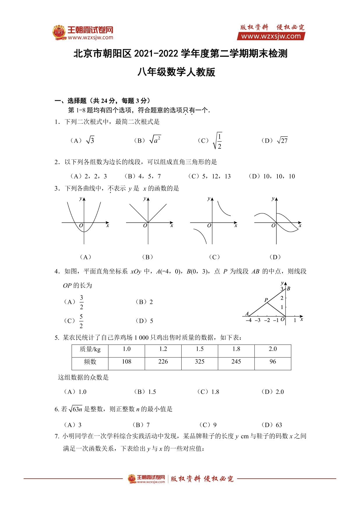 北京市朝阳区2021-2022学年度第二学期期末检测八年级数学(人教版)