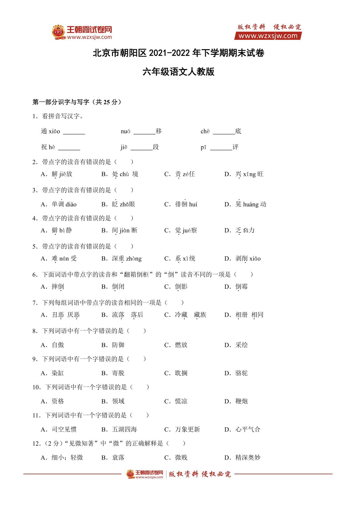 北京市朝阳区2021-2022年下学期期末试卷六年级语文(人教版)