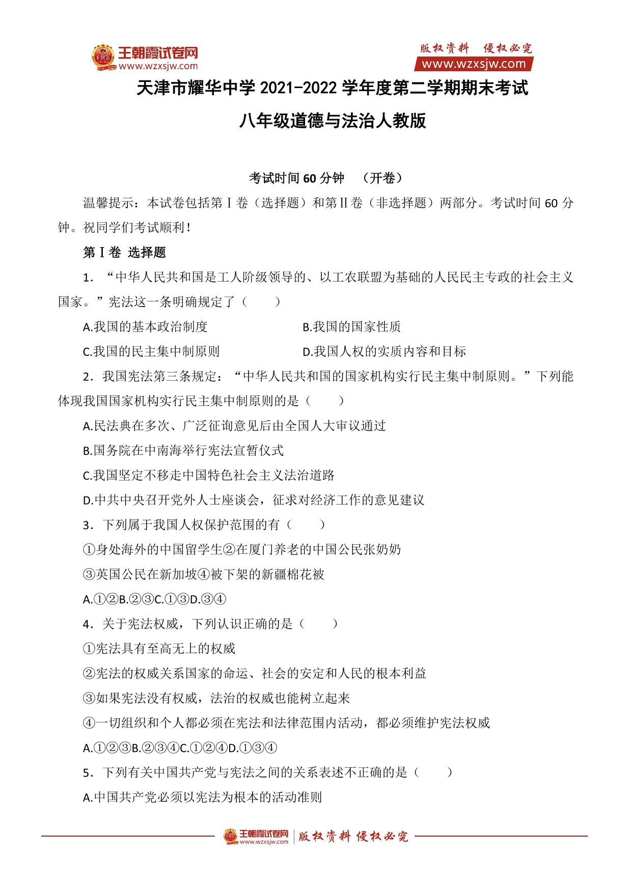 天津市耀华中学2021-2022学年度第二学期期末考试八年级道德与法治(人教版)