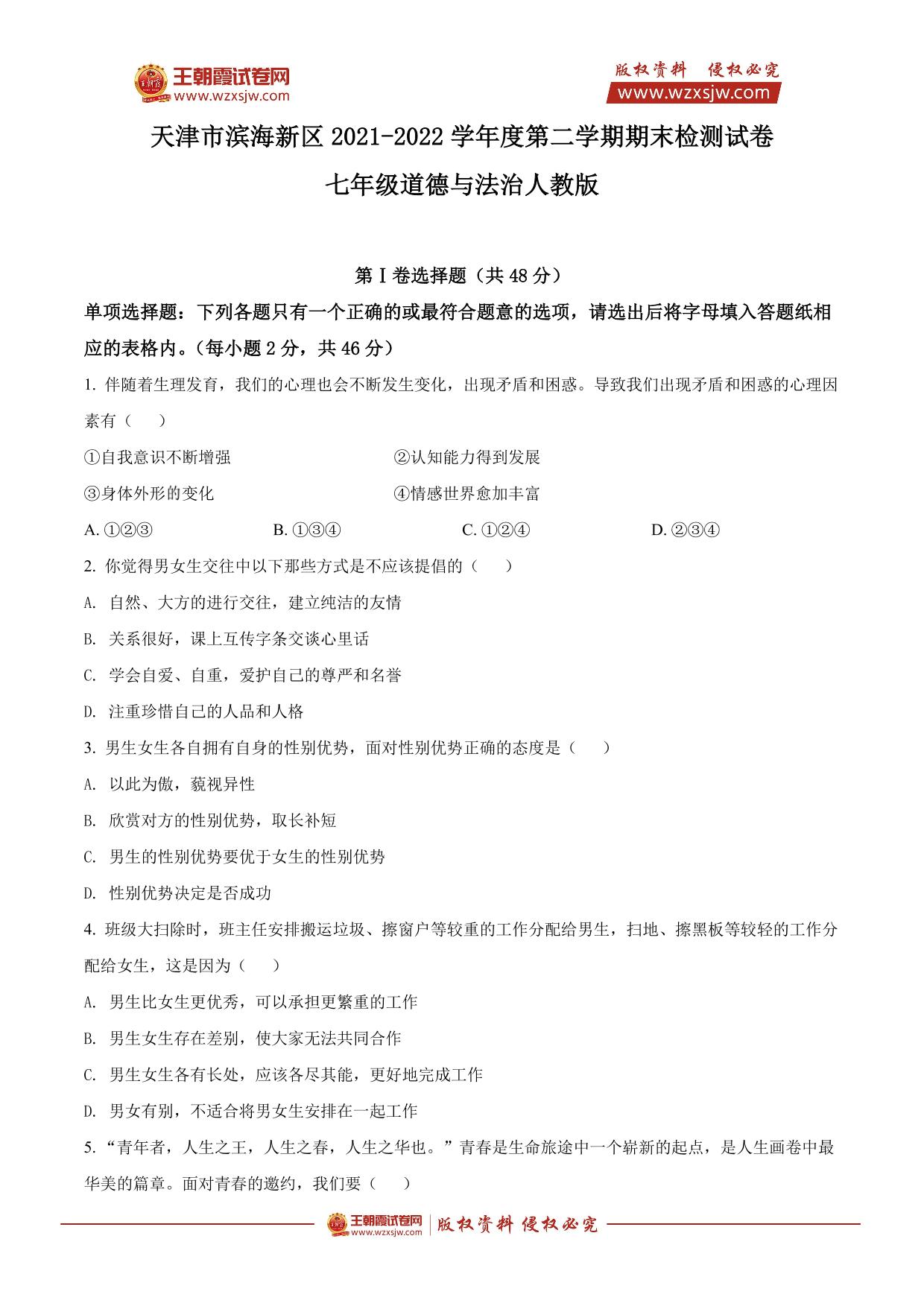 天津市滨海新区2021-2022学年度第二学期期末检测试卷七年级道德与法治(人教版)