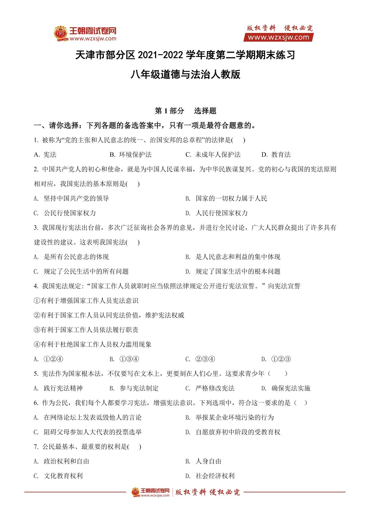天津市部分区2021-2022学年度第二学期期末练习八年级道德与法治(人教版)