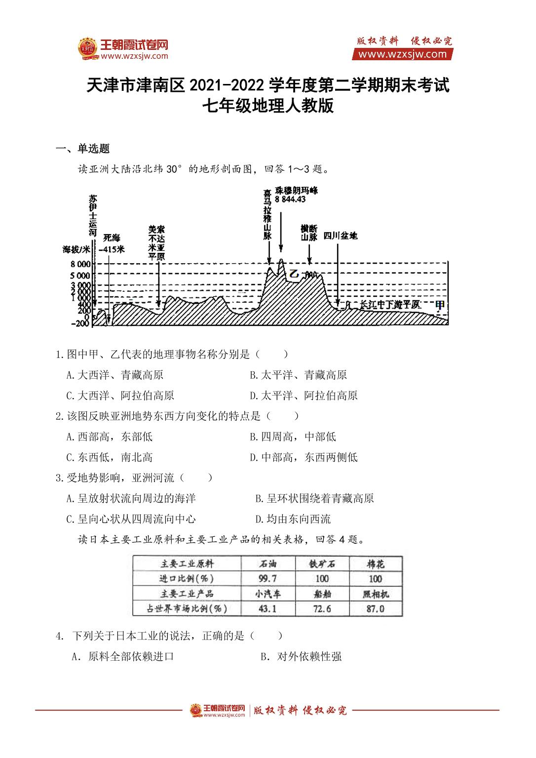 天津市津南区2021-2022学年度第二学期期末考试七年级地理(人教版)