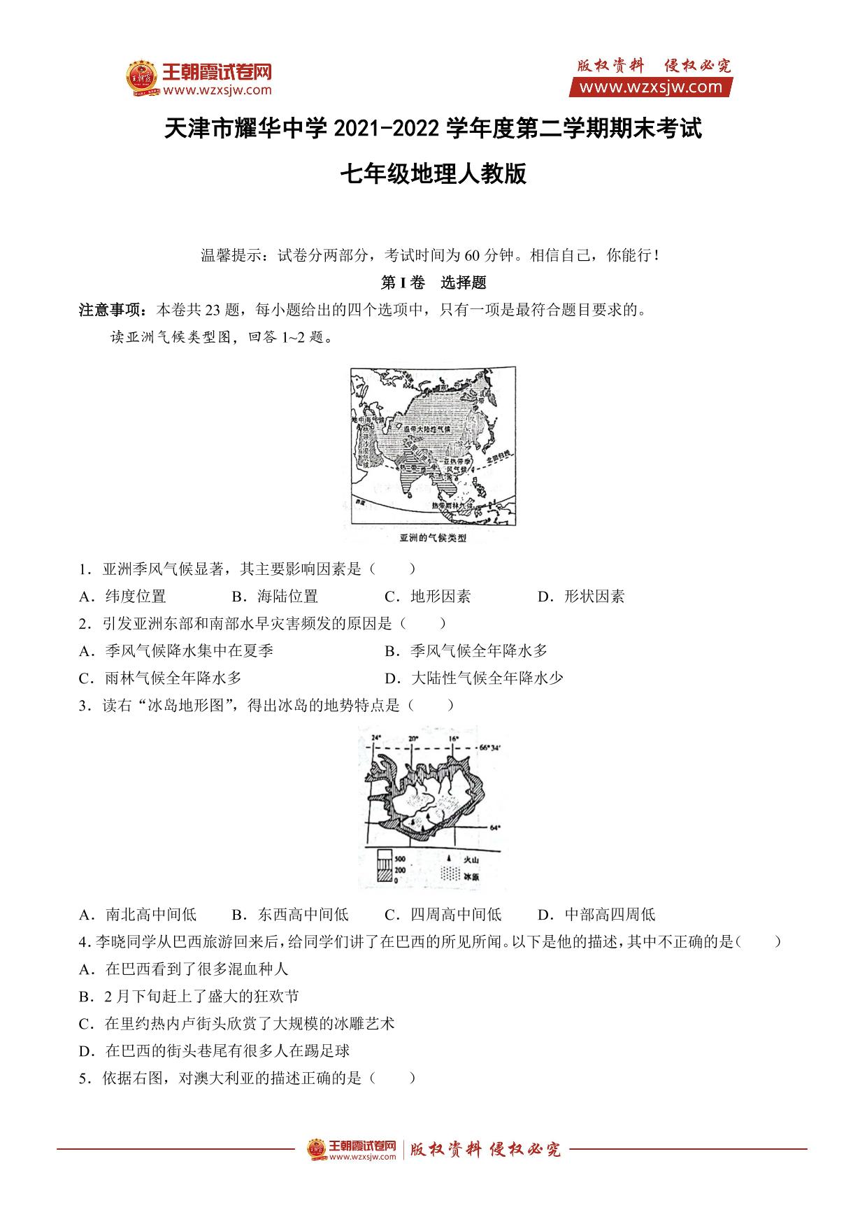 天津市耀华中学2021-2022学年度第二学期期末考试七年级地理(人教版)