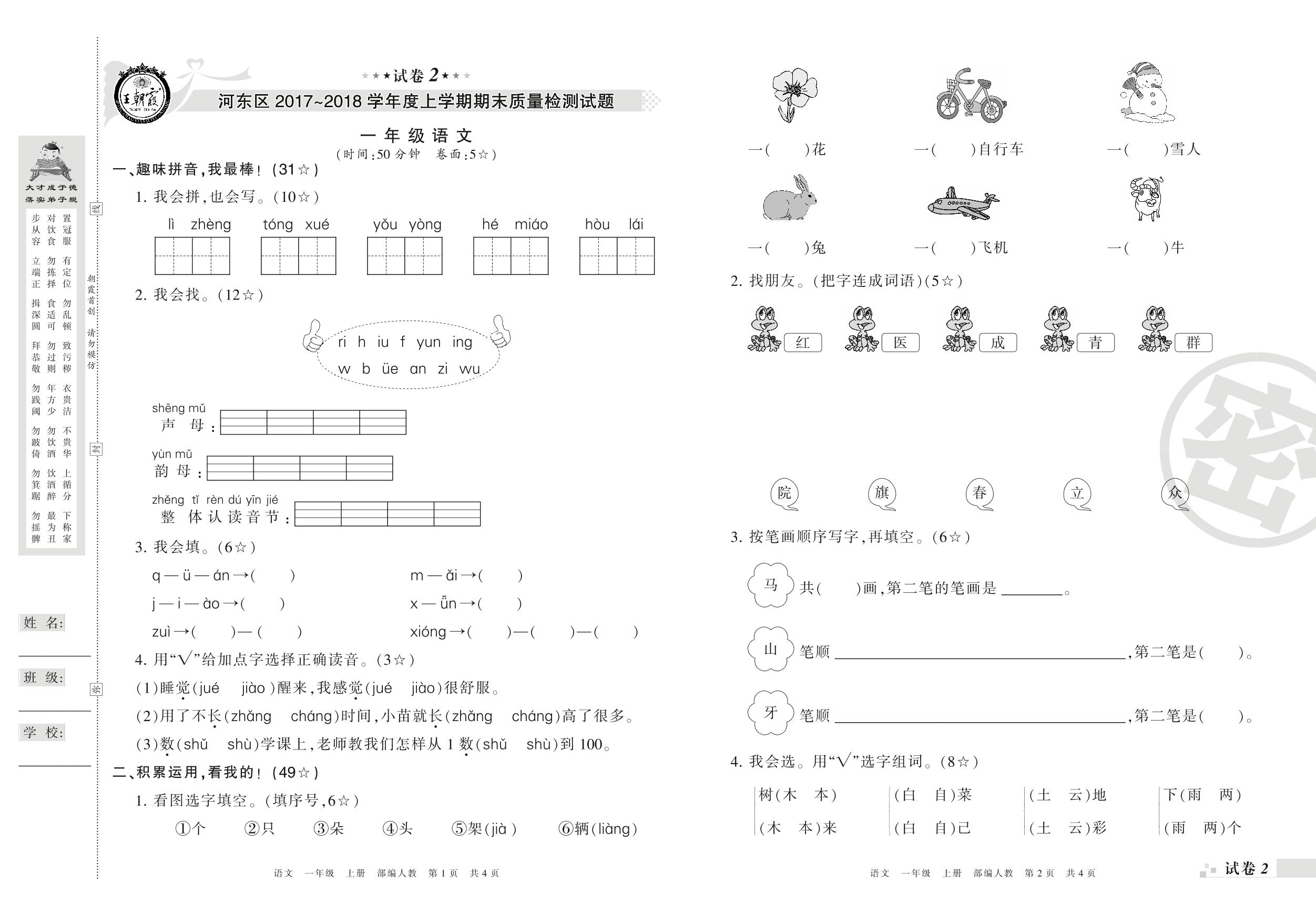 2017-2018学年第一学期临沂市河东区一年级语文试卷(人教版)【2】