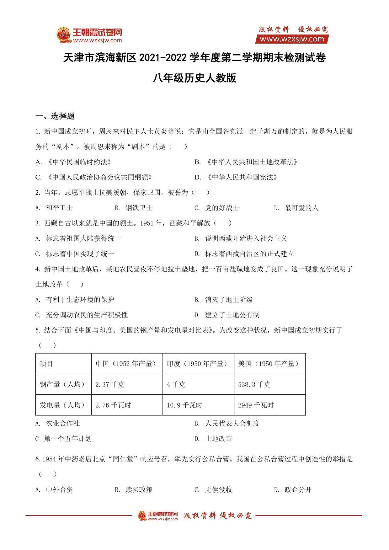 天津市滨海新区2021-2022学年度第二学期期末检测试卷八年级历史(人教版)