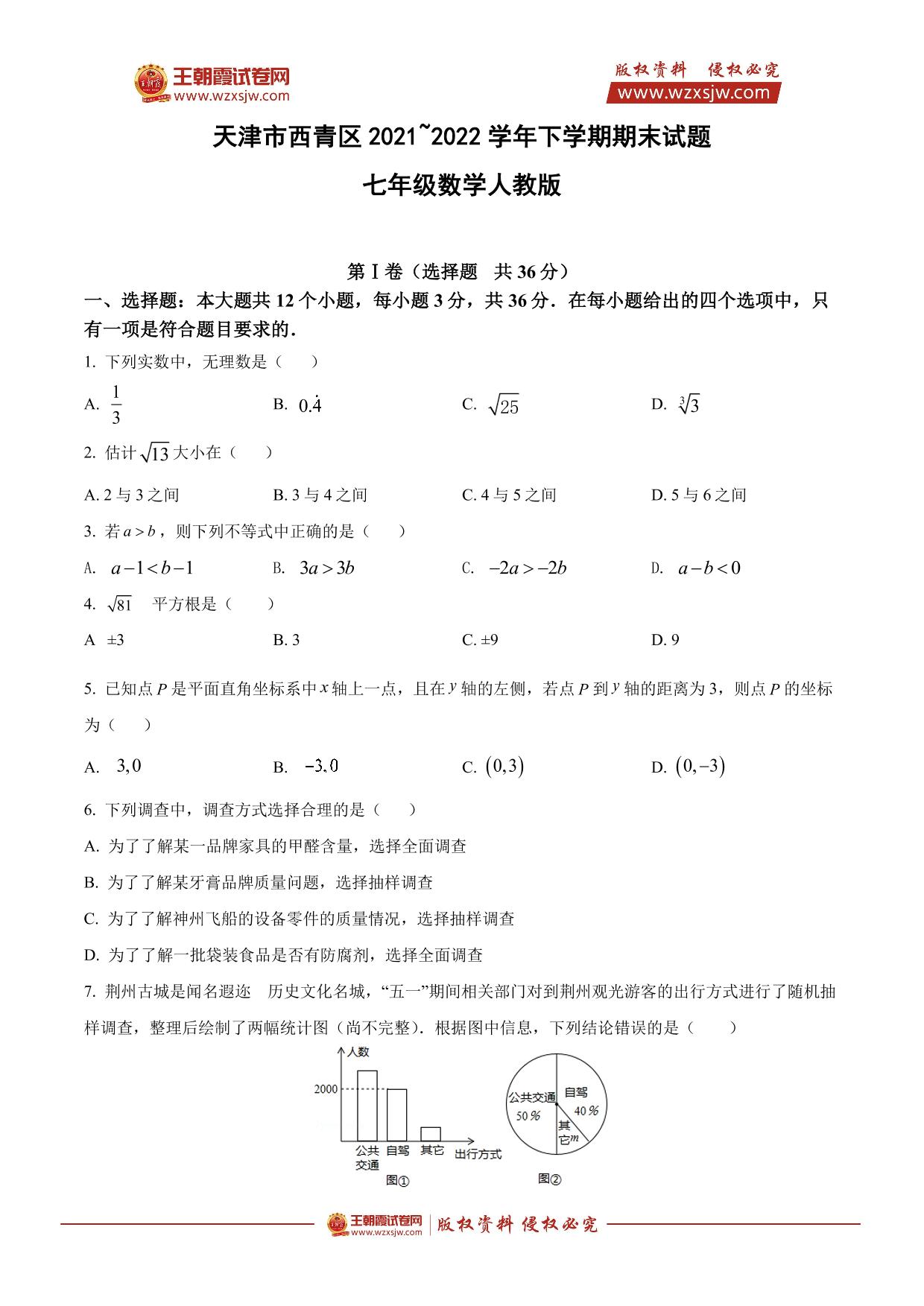 天津市西青区2021-2022学年下学期期末试题七年级数学(人教版)
