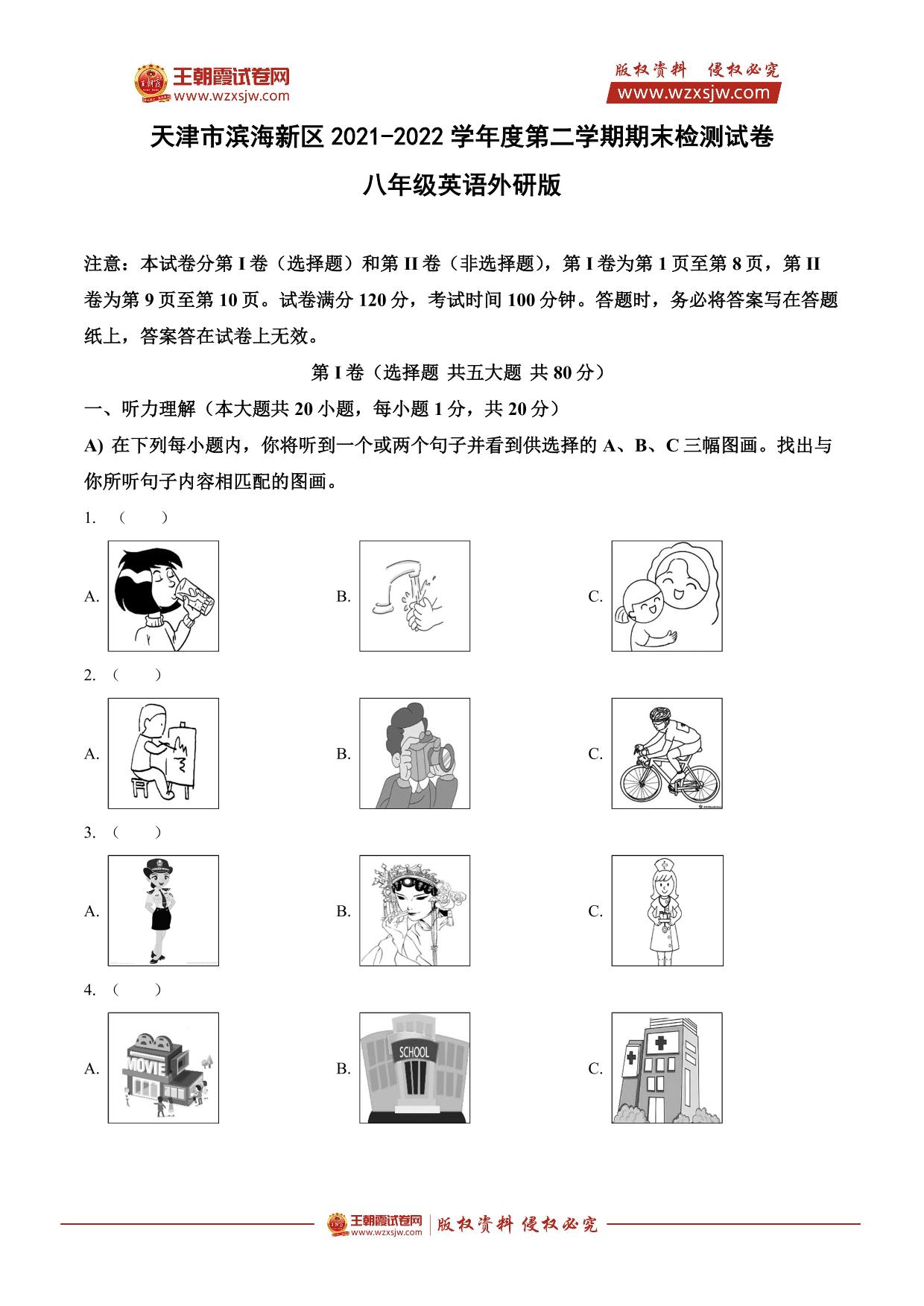 天津市滨海新区2021-2022学年度第二学期期末检测试卷八年级英语(外研版)【无听力音频】