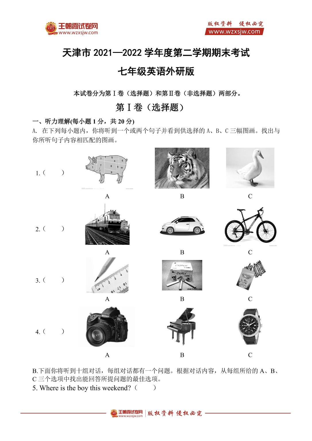 天津市2021-2022学年度第二学期期末考试七年级英语(外研版)【无听力音频】