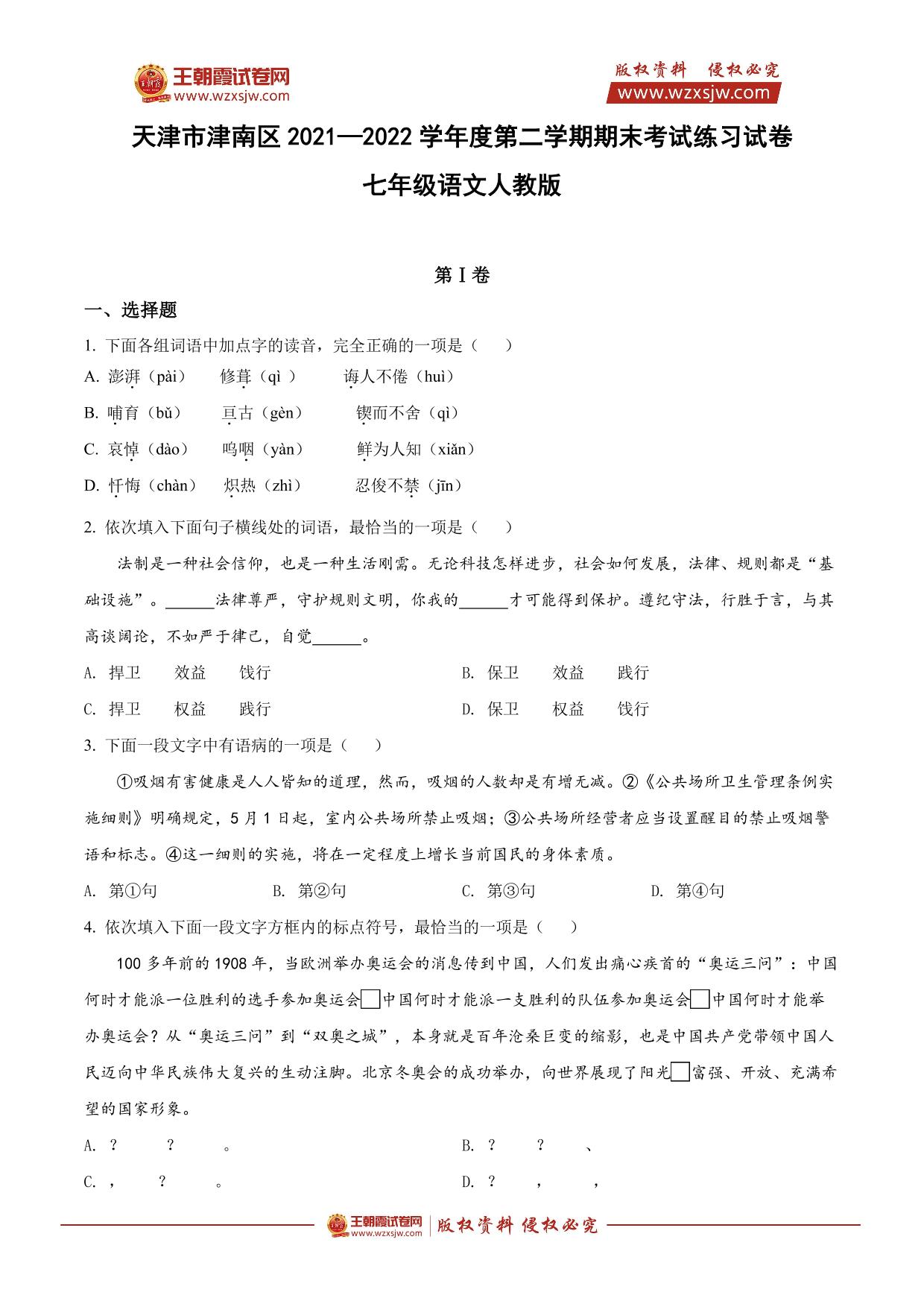 天津市津南区2021-2022学年度第二学期期末考试练习试卷七年级语文(人教版)