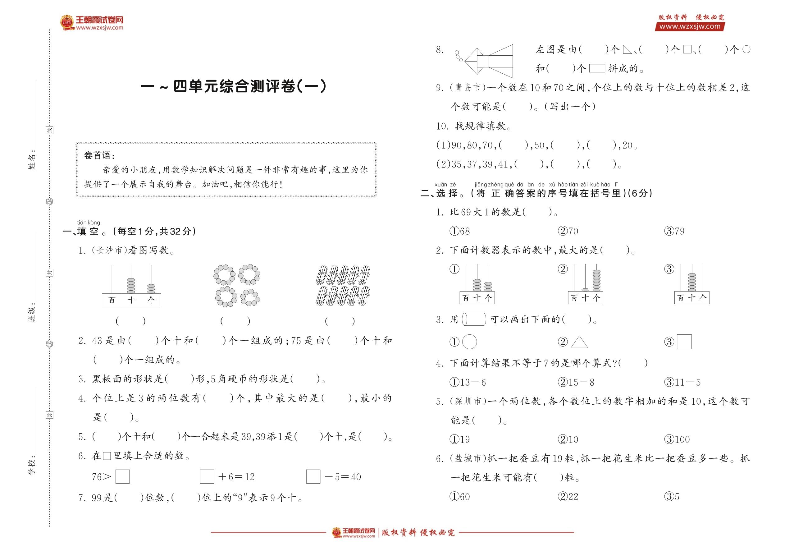一年级数学苏教版下册单元卷