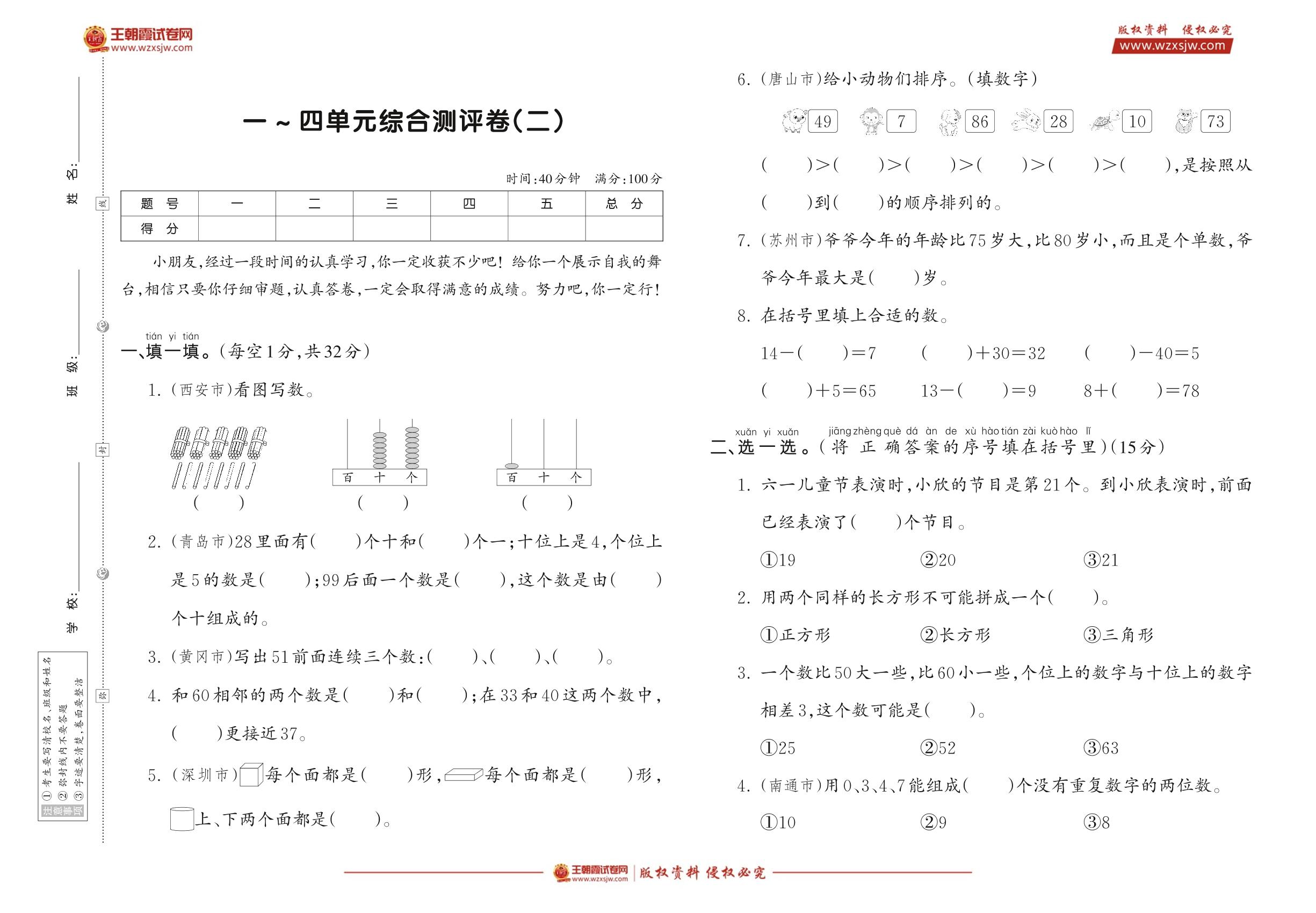 一年级数学苏教版下册单元卷