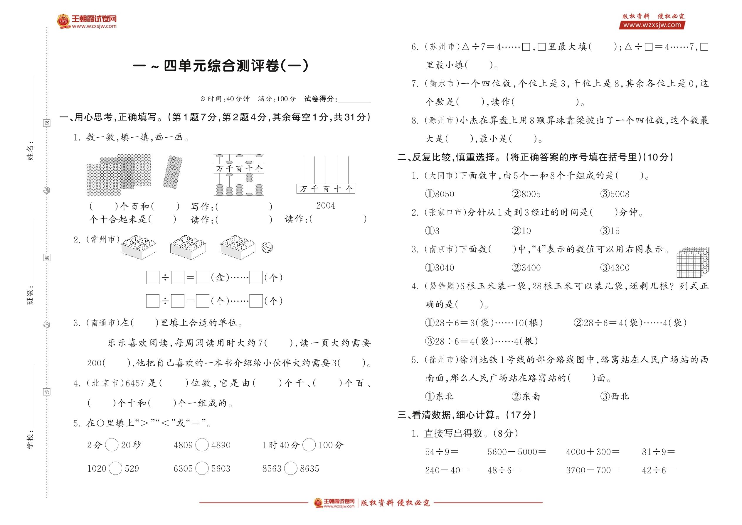【寒假预习助手·综合测评】一~四单元综合测评卷(一)_R230104135732544