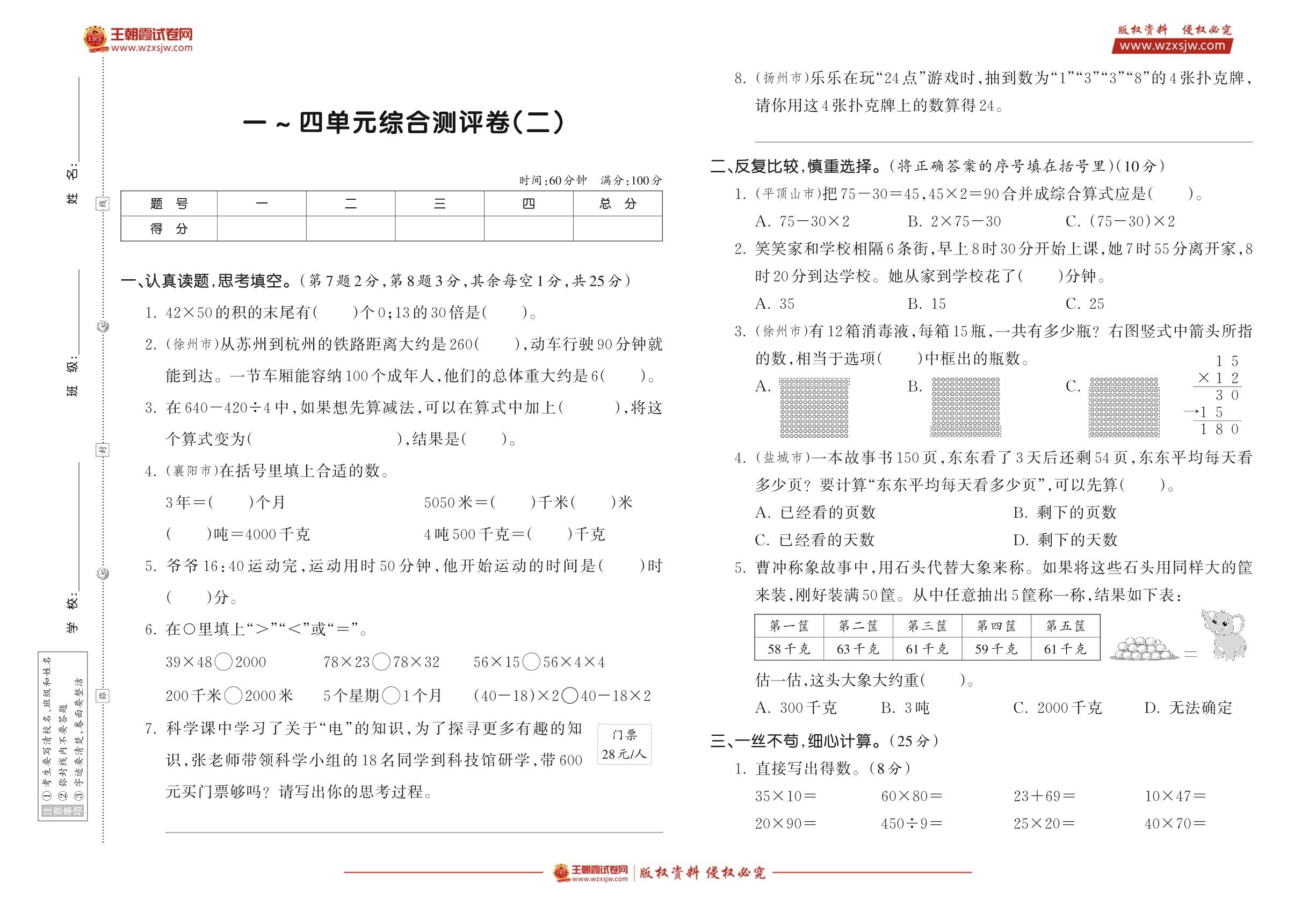 三年级数学苏教版下册单元卷