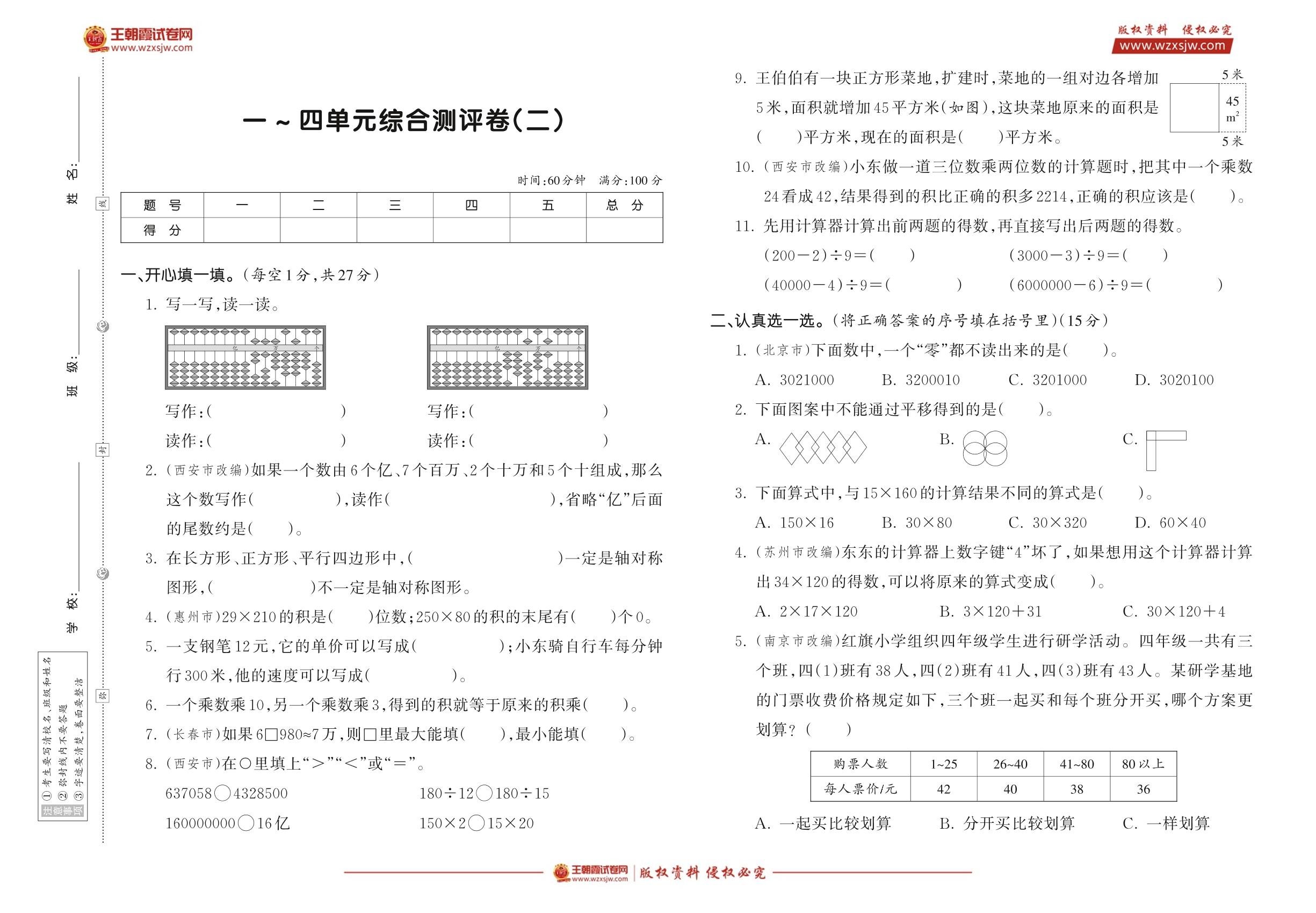 【寒假预习助手·综合测评】一~四单元综合测评卷(二)_R230104140519556