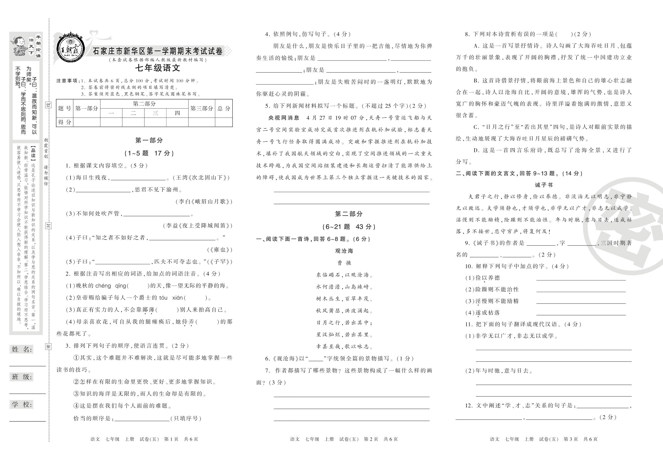 2016-2017学年第一学期石家庄市新华区七年级语文试卷(人教版)【5】