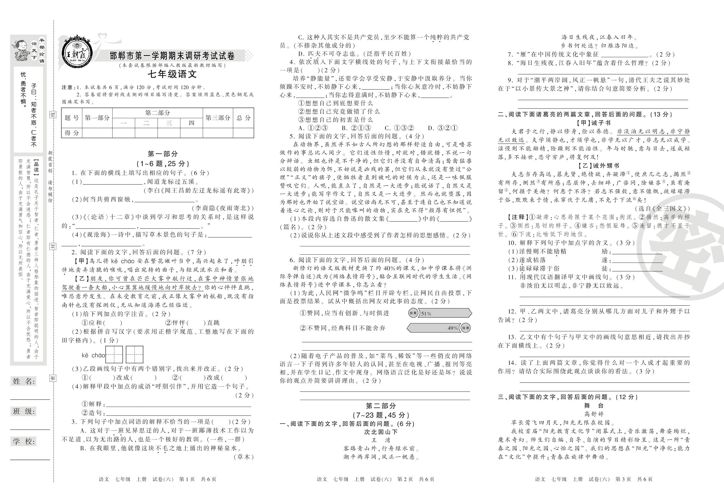 2016-2017学年第一学期邯郸市七年级语文试卷(人教版)【6】
