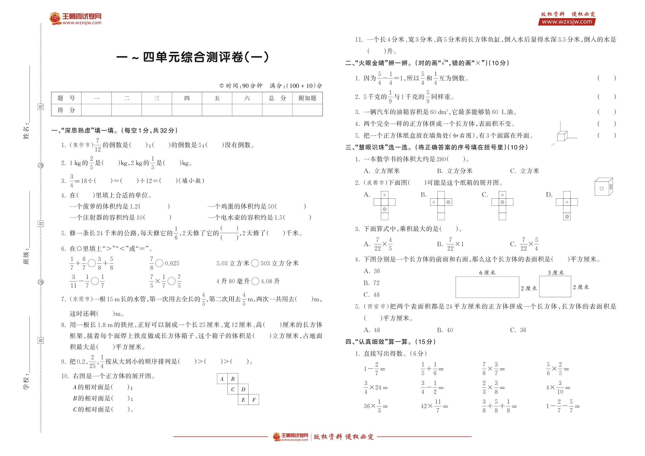【寒假预习助手·综合测评】一~四单元综合测评卷(一)_R230104143445243