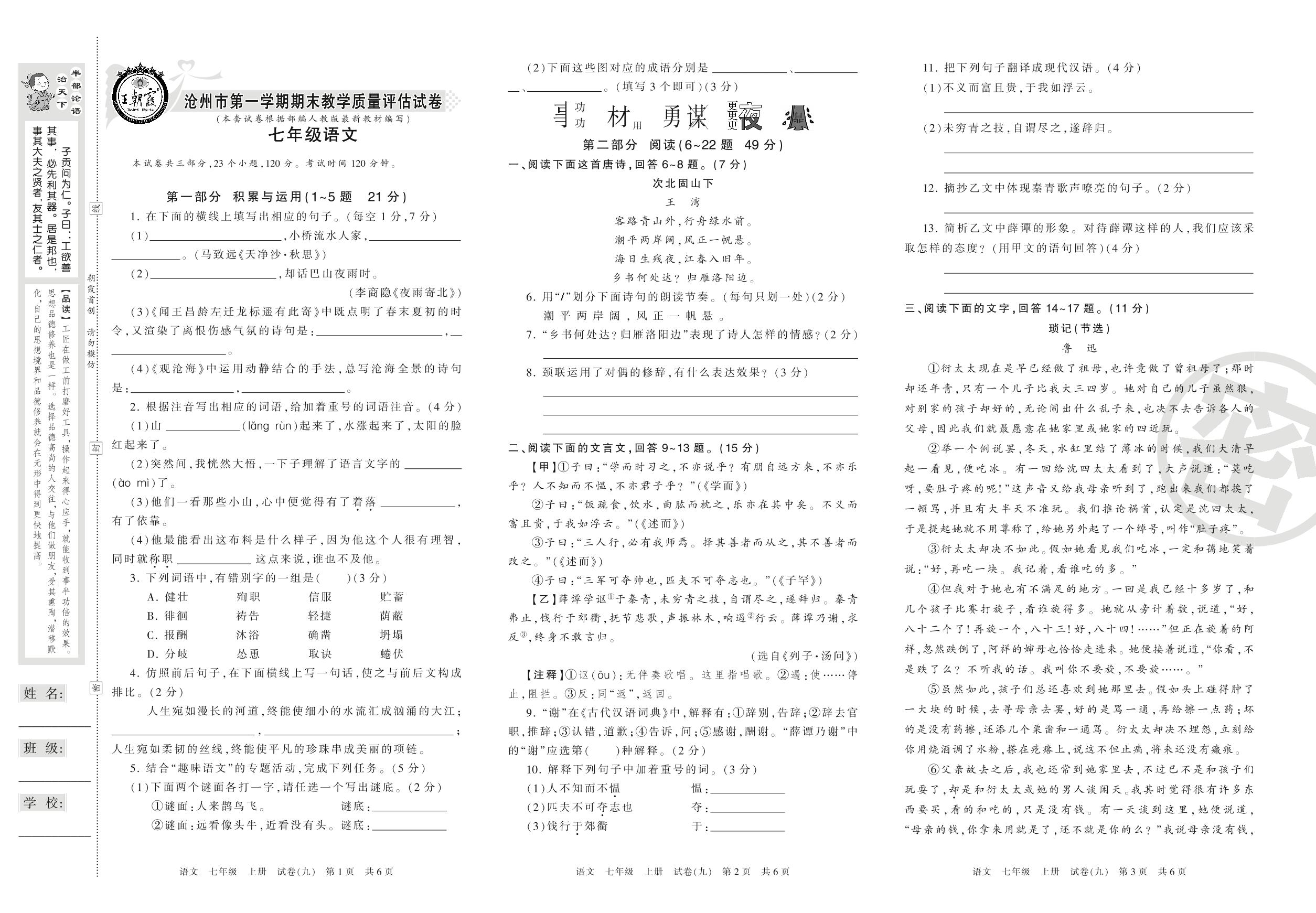 2016-2017学年第一学期沧州市七年级语文试卷(人教版)【9】