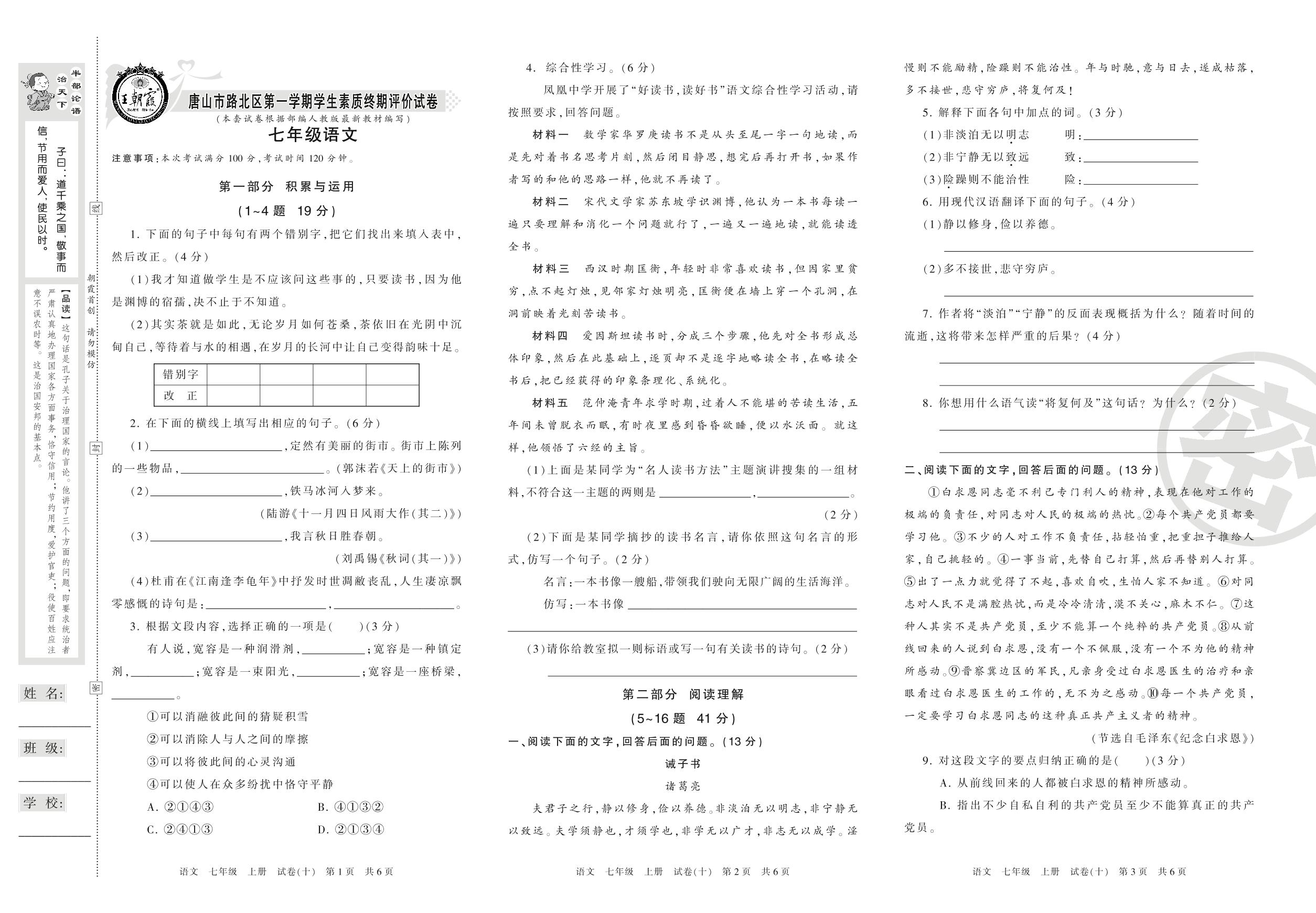 2016-2017学年第一学期唐山市路北区七年级语文试卷(人教版)【10】