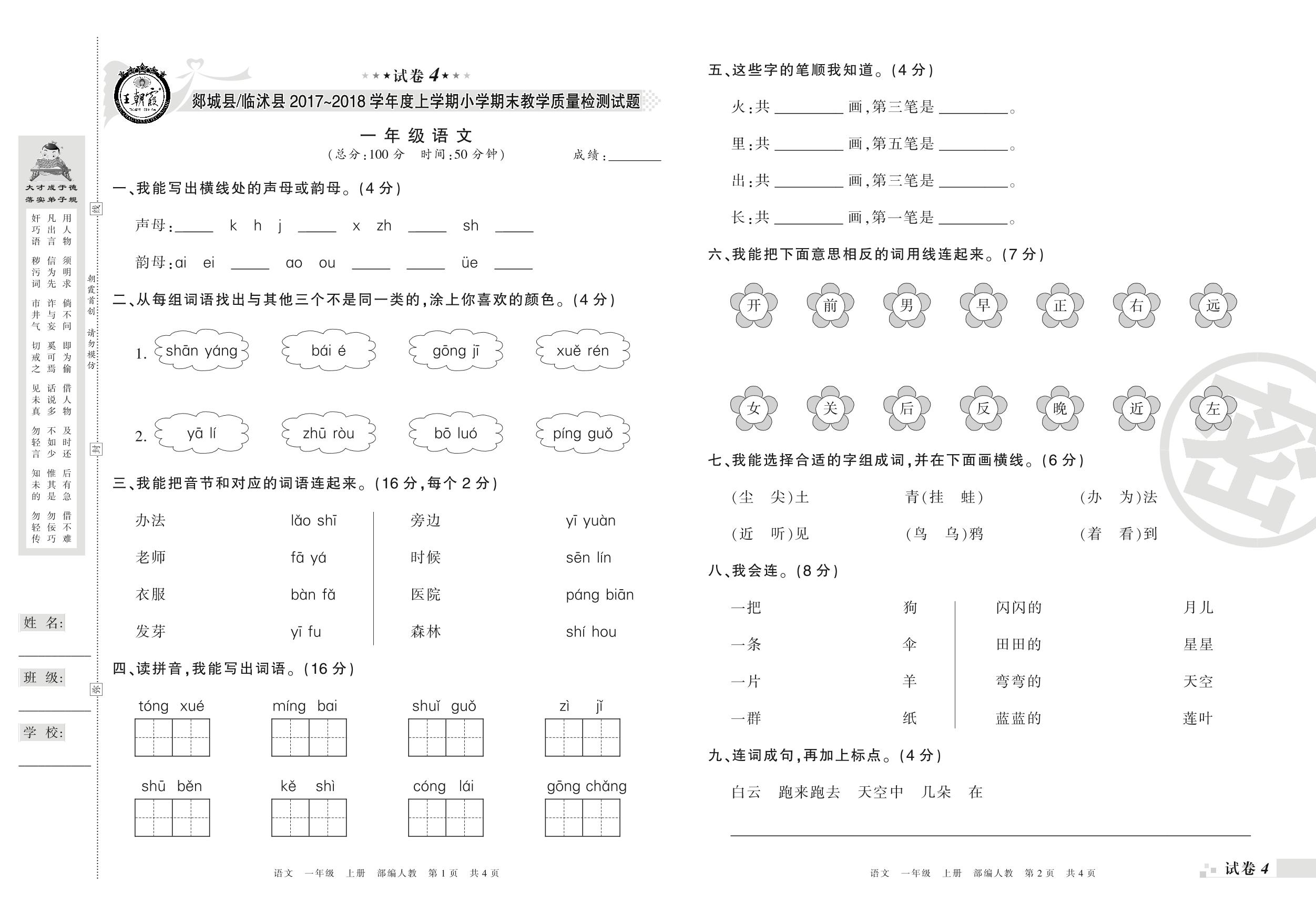 2017-2018学年第一学期临沂市郯城县(临沭县)一年级语文试卷(人教版)【4】