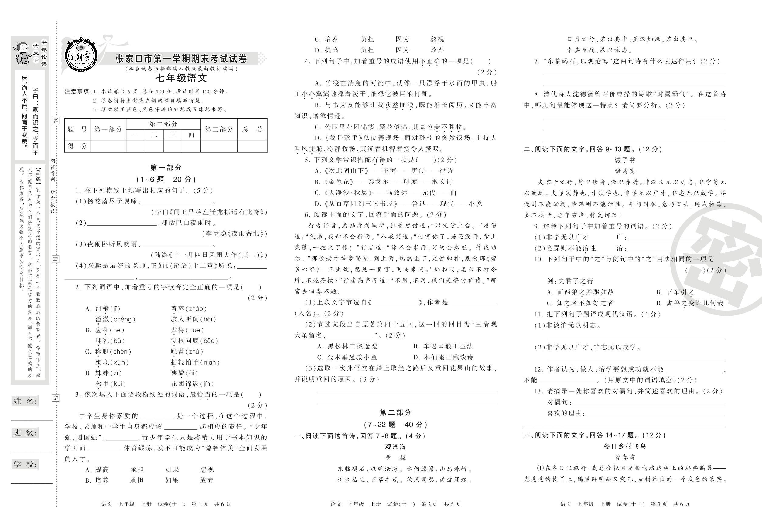 2016-2017学年第一学期张家口市七年级语文试卷(人教版)【11】