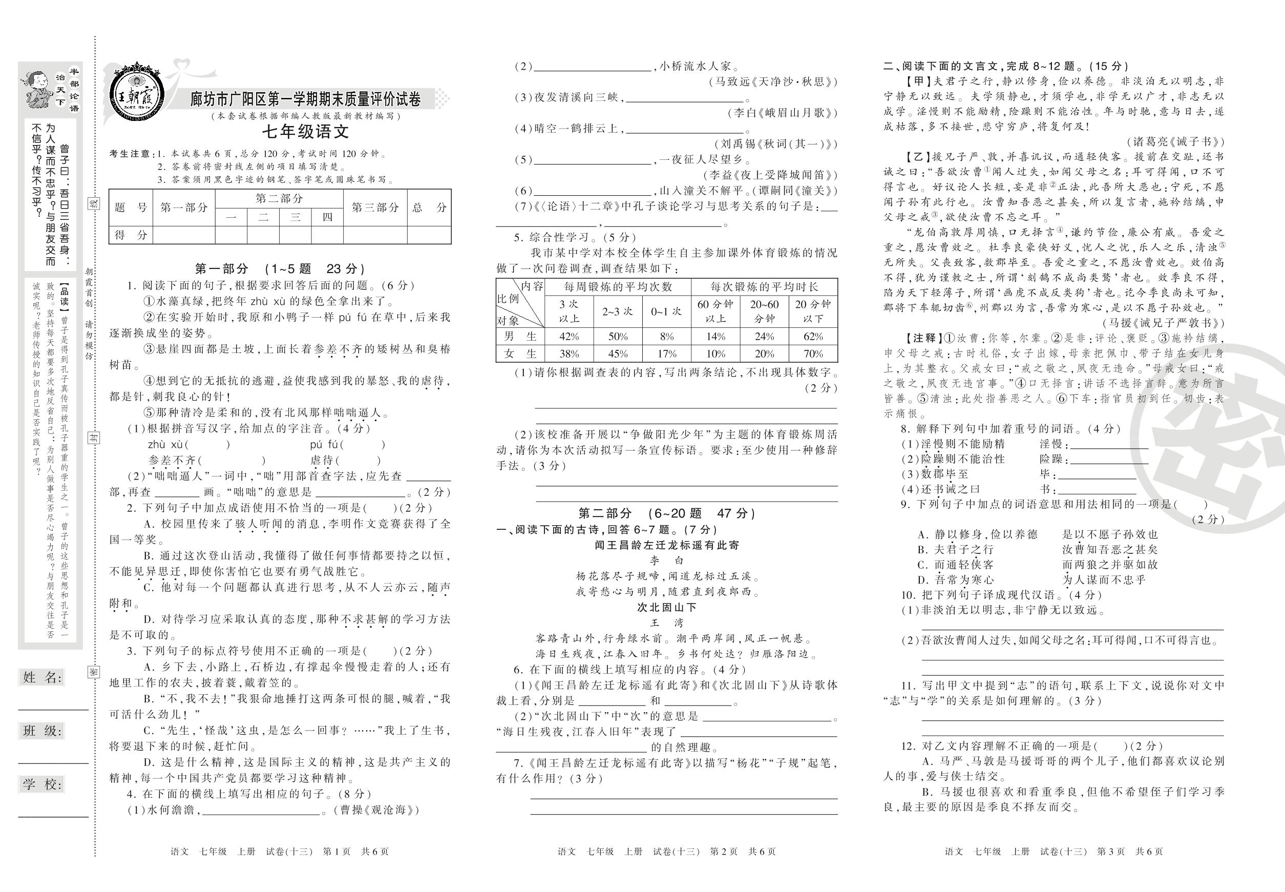 2016-2017学年第一学期廊坊市广阳区七年级语文试卷(人教版)【13】