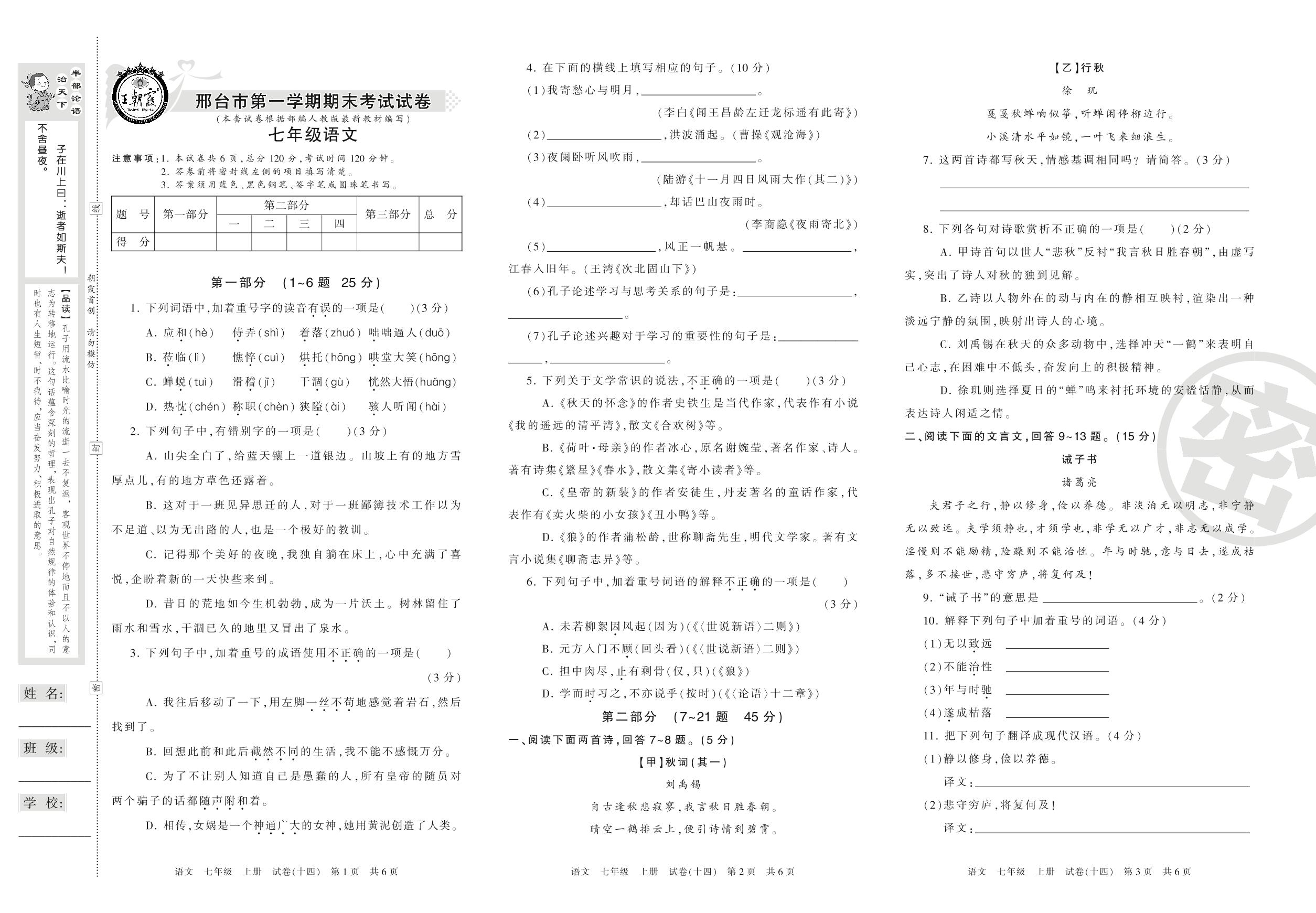 2016-2017学年第一学期邢台市七年级语文试卷(人教版)【14】