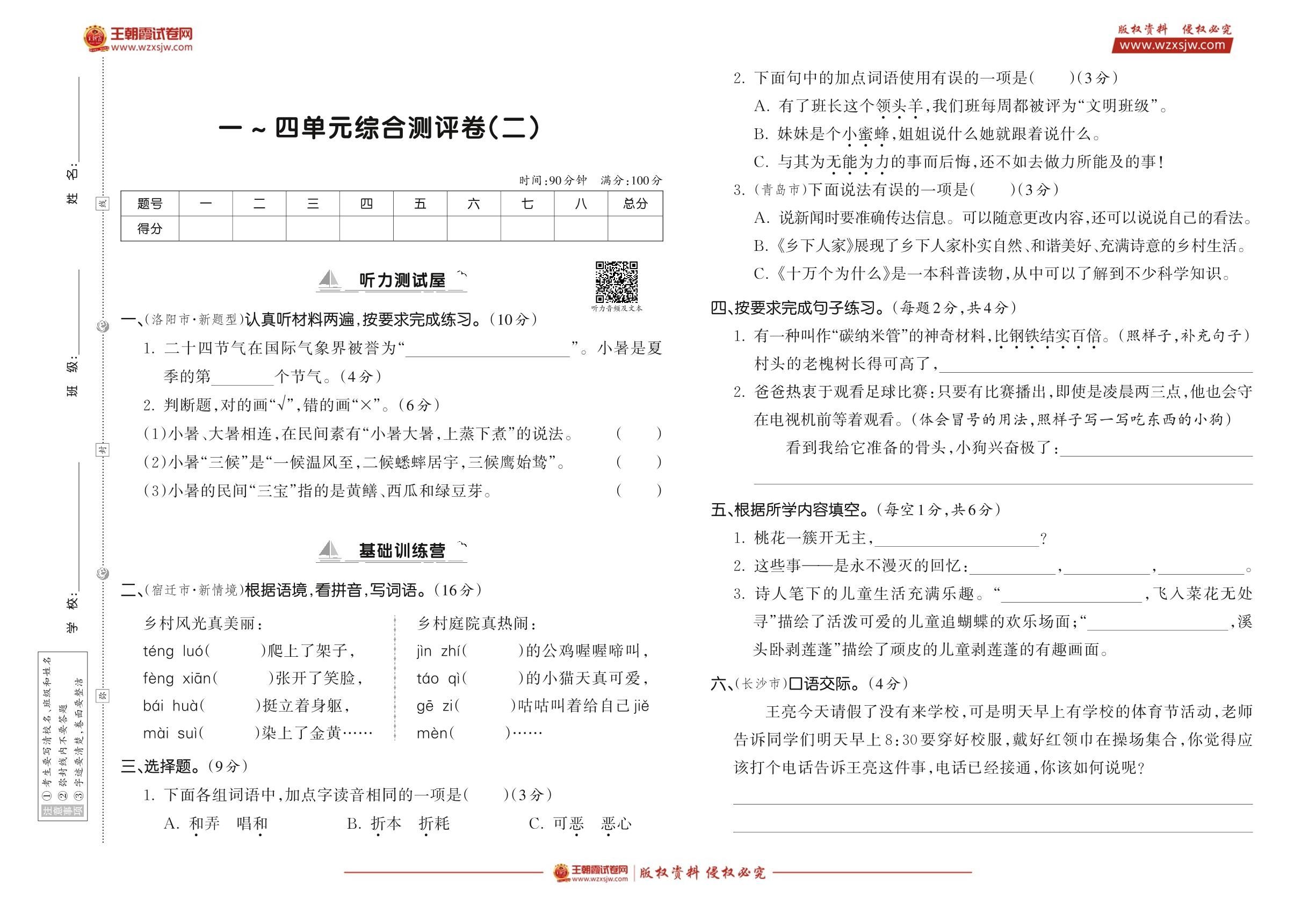 【寒假预习助手·综合测评】一~四单元综合测评卷(二)(人教四语下)