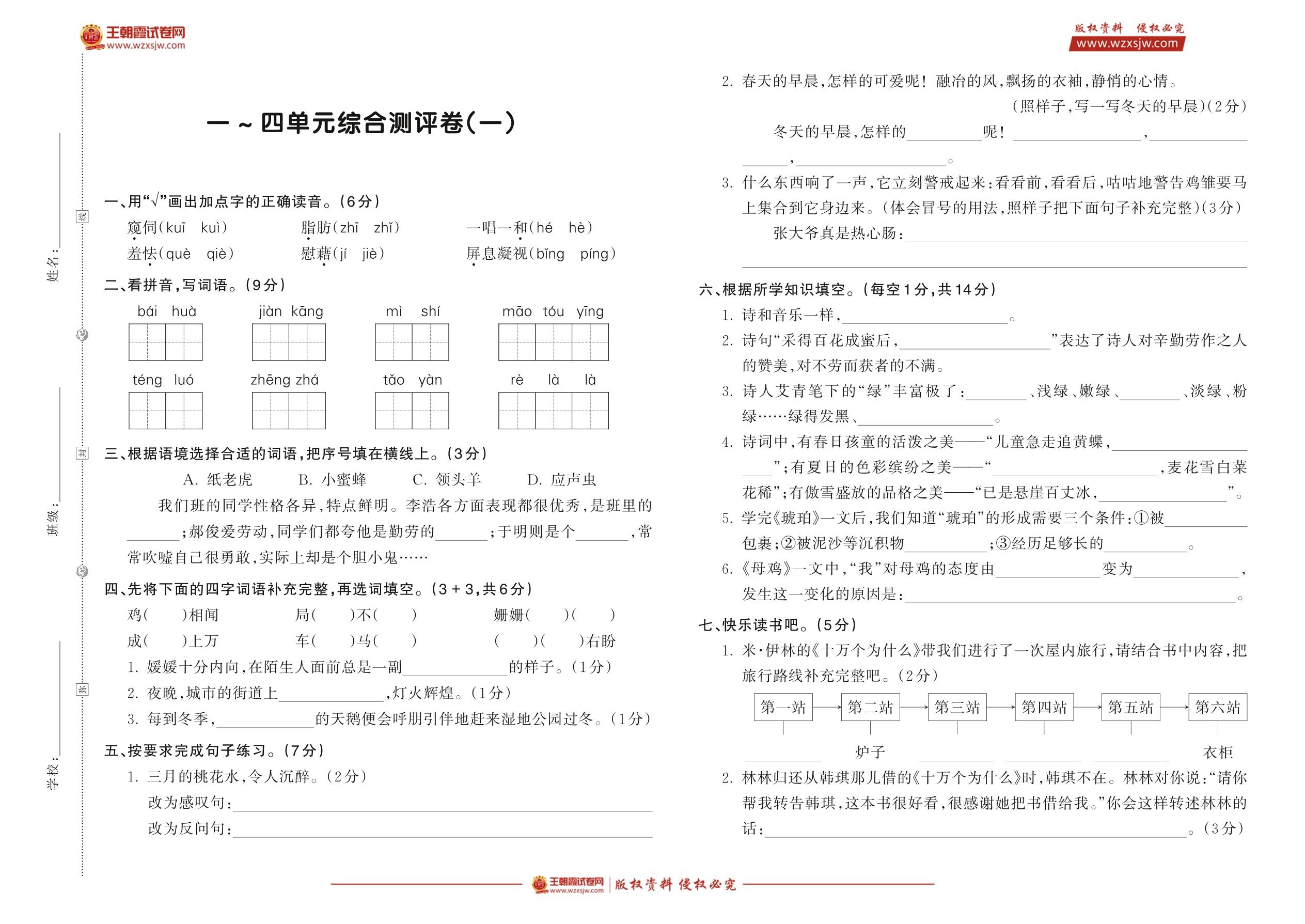 【寒假预习助手·综合测评】一~四单元综合测评卷(一)(人教四语下)