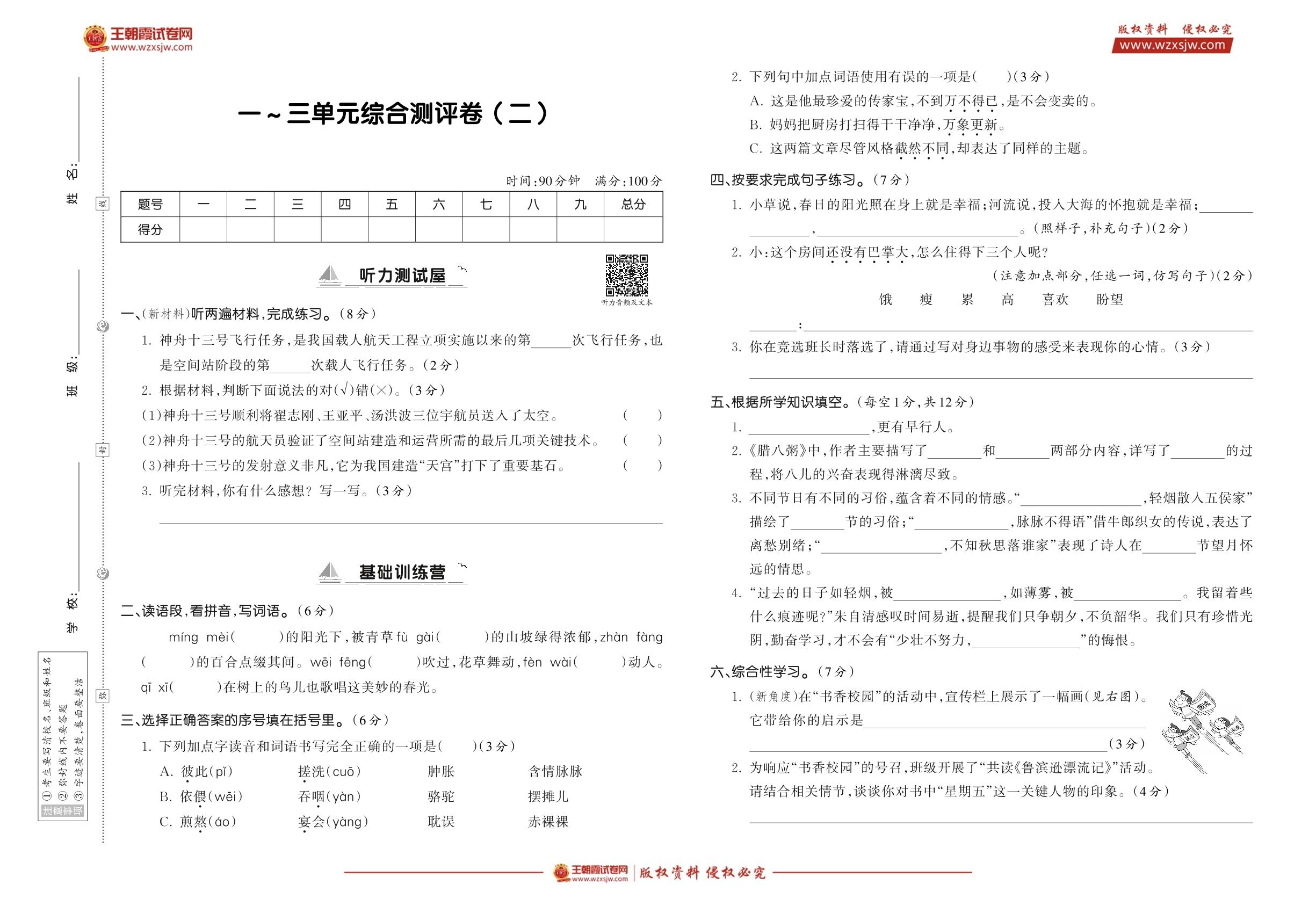 【寒假预习助手·综合测评】一~三单元综合测评卷(二)(人教六语下)