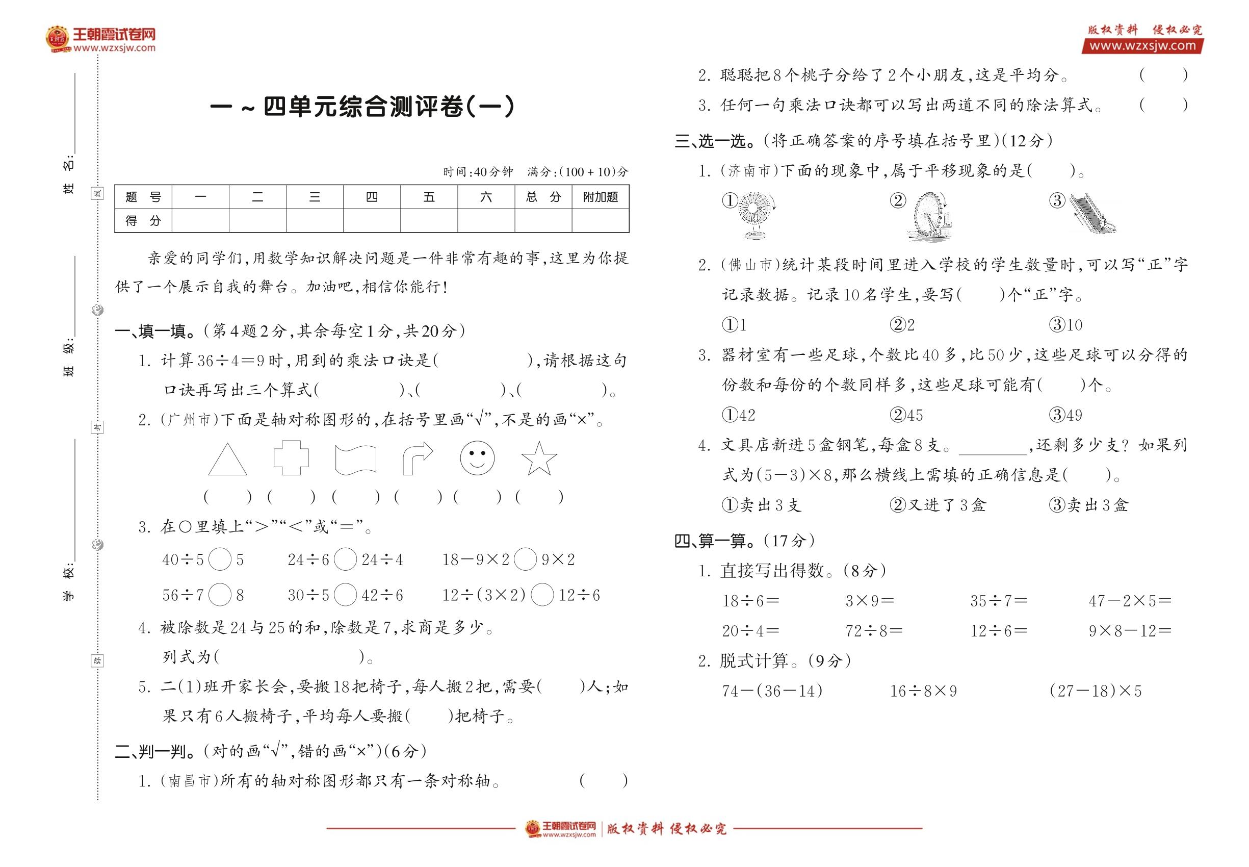 【寒假预习助手·综合测评】一~四单元综合测评卷(一)_R230104175716968