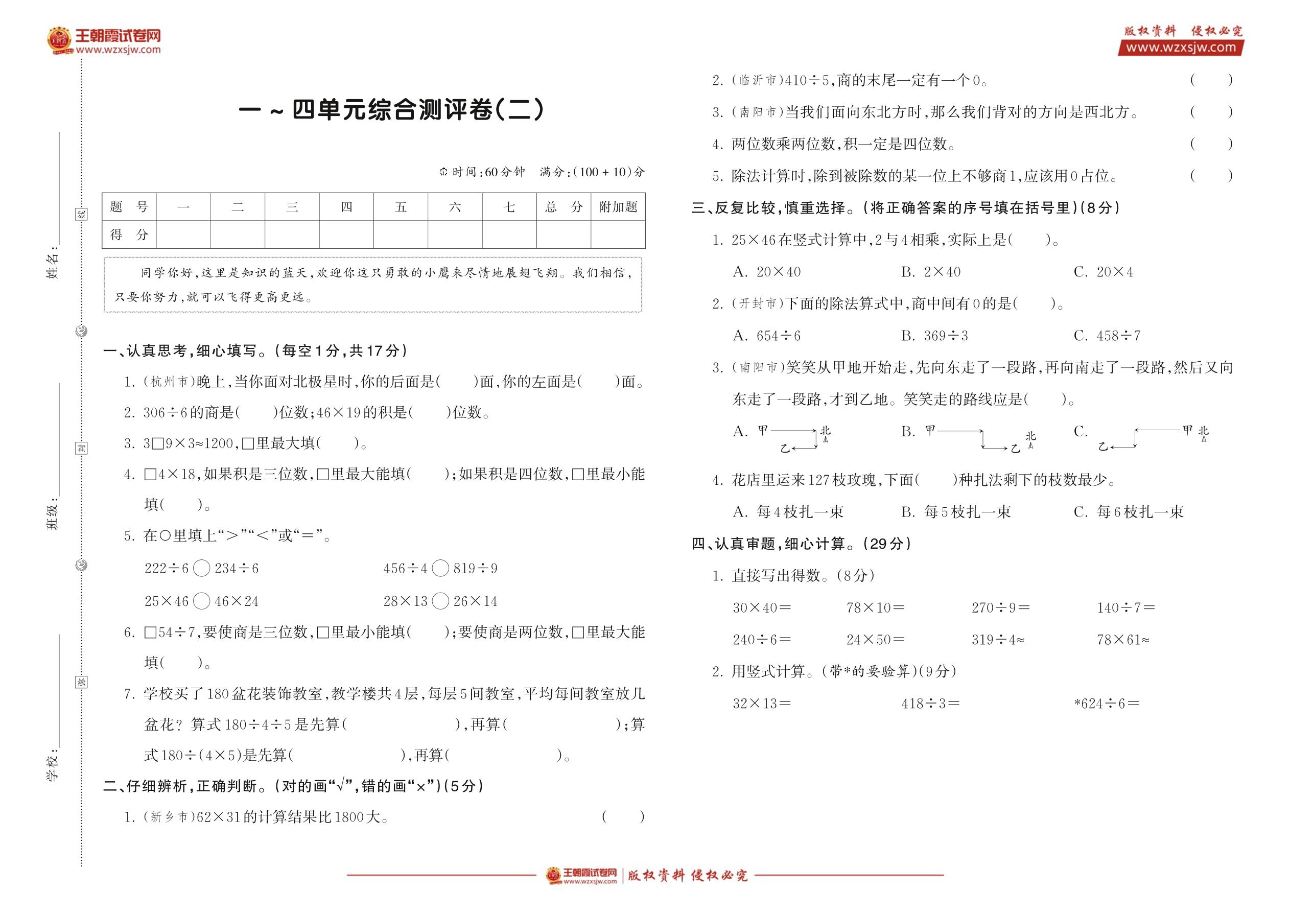 【寒假预习助手·综合测评】一~四单元综合测评卷(二)_R230104180018087