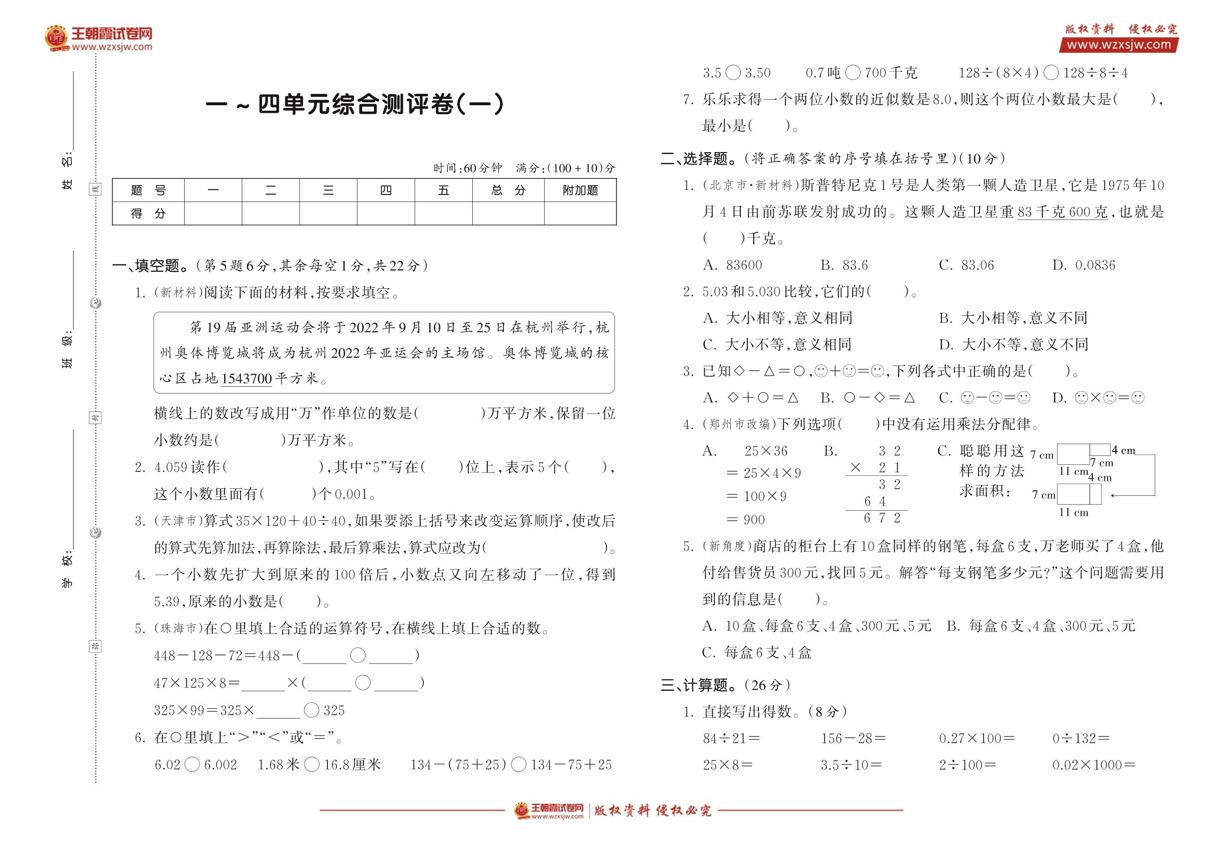 【寒假预习助手·综合测评】一~四单元综合测评卷(一)_R230104180317117
