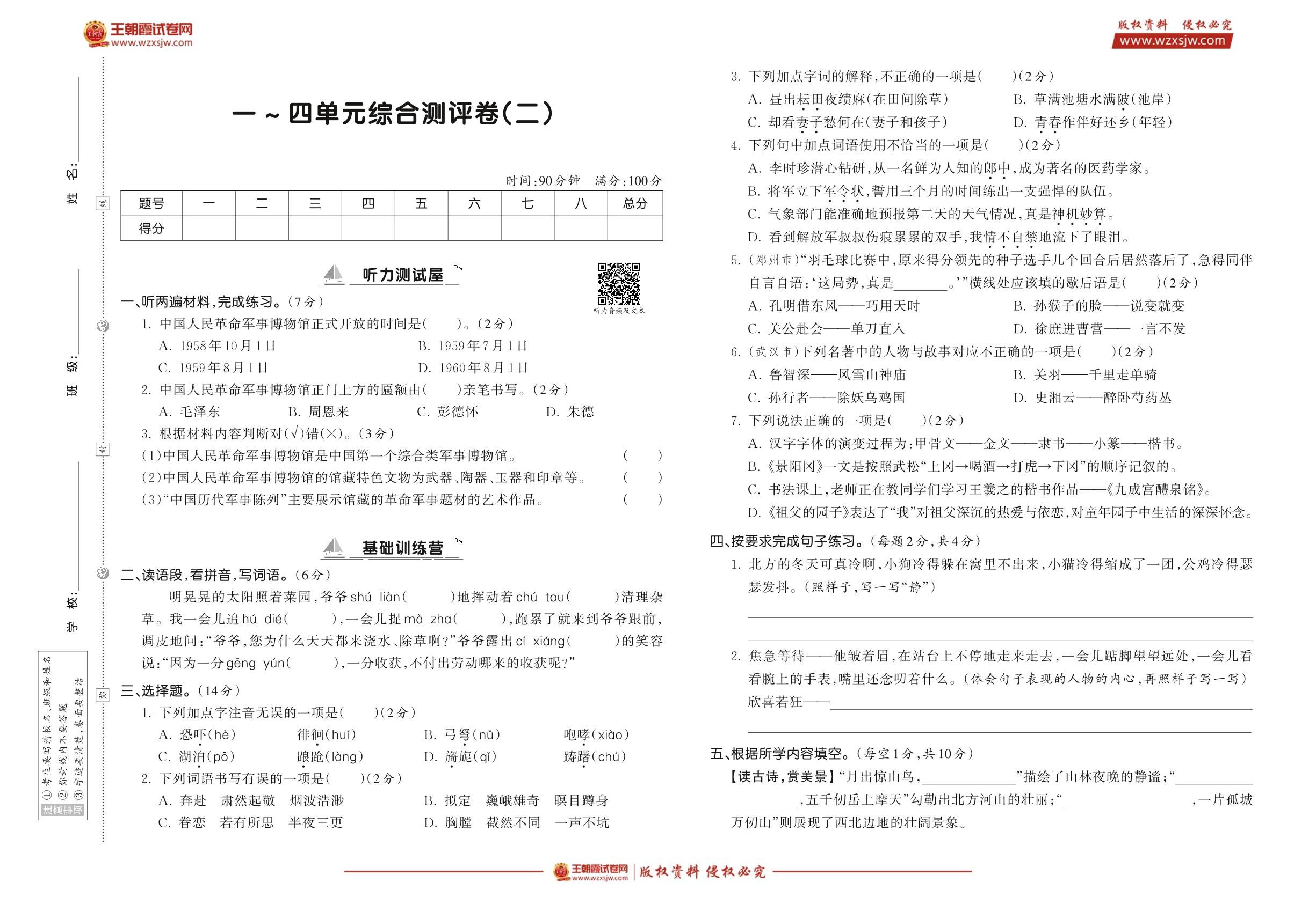 【寒假预习助手·综合测评】一~四单元综合测评卷(二)(人教五语下)