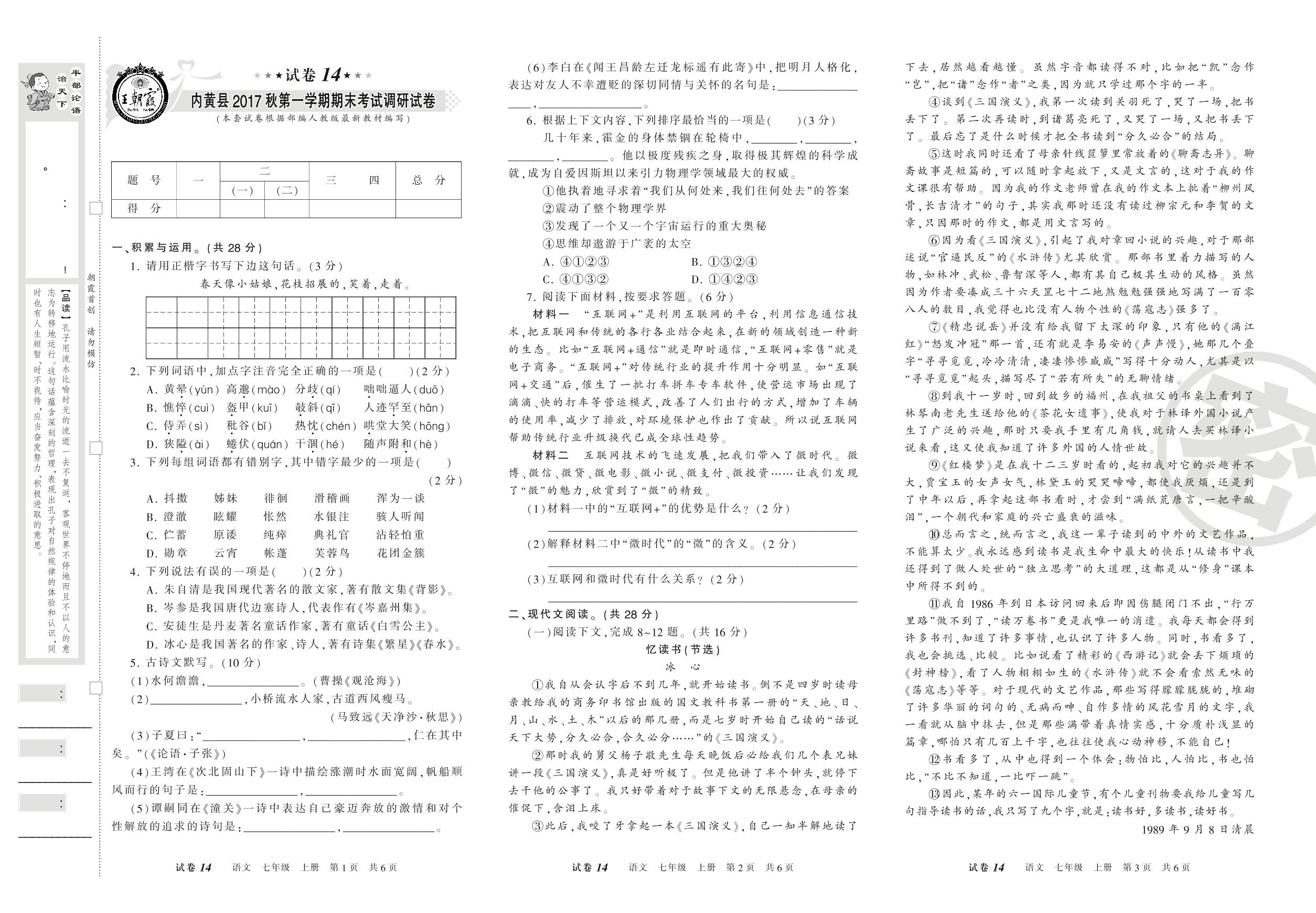 2016-2017学年第一学期安阳市内黄县七年级语文试卷(人教版)【14】
