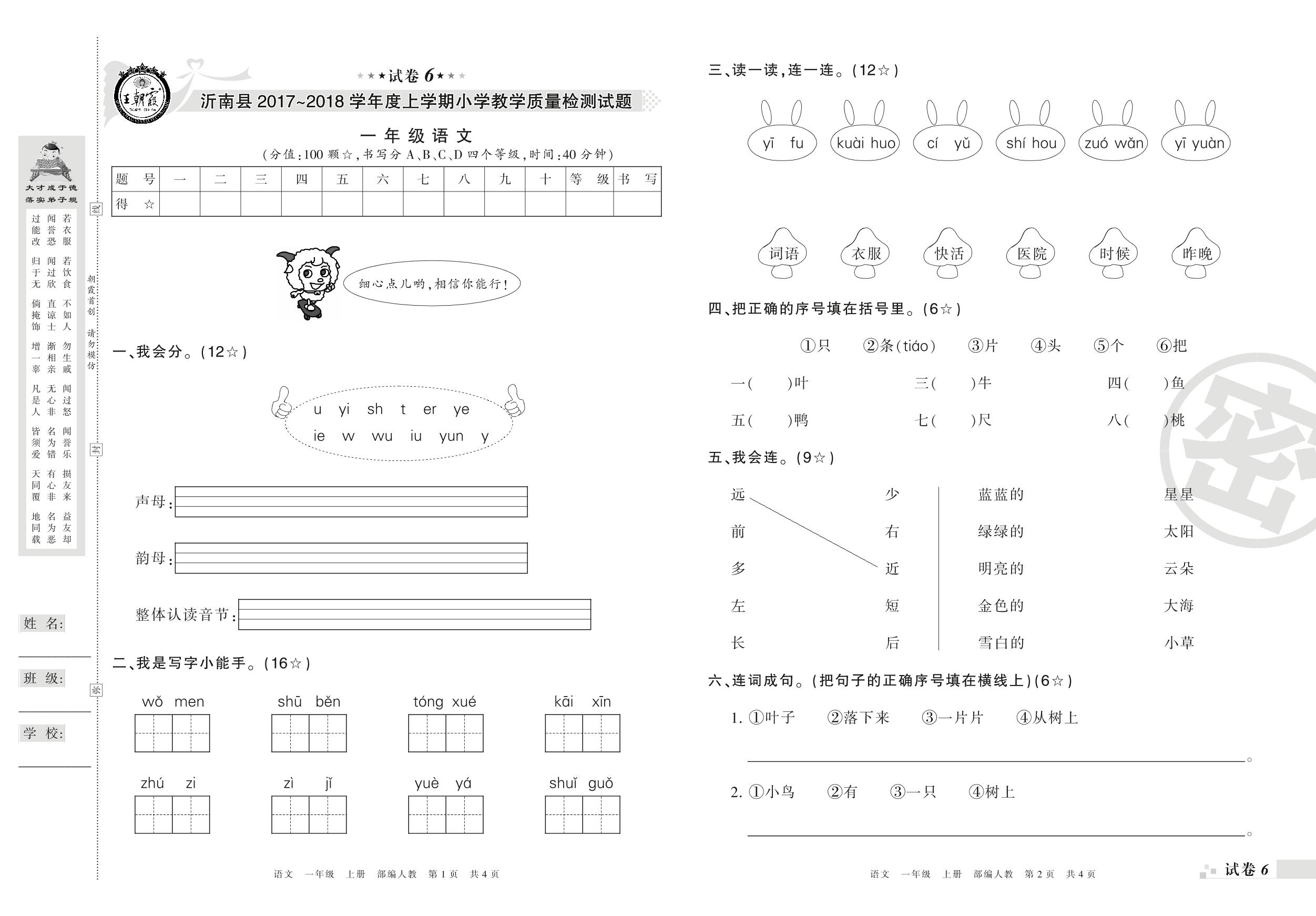 2017-2018学年第一学期临沂市沂南县一年级语文试卷(人教版)【6】