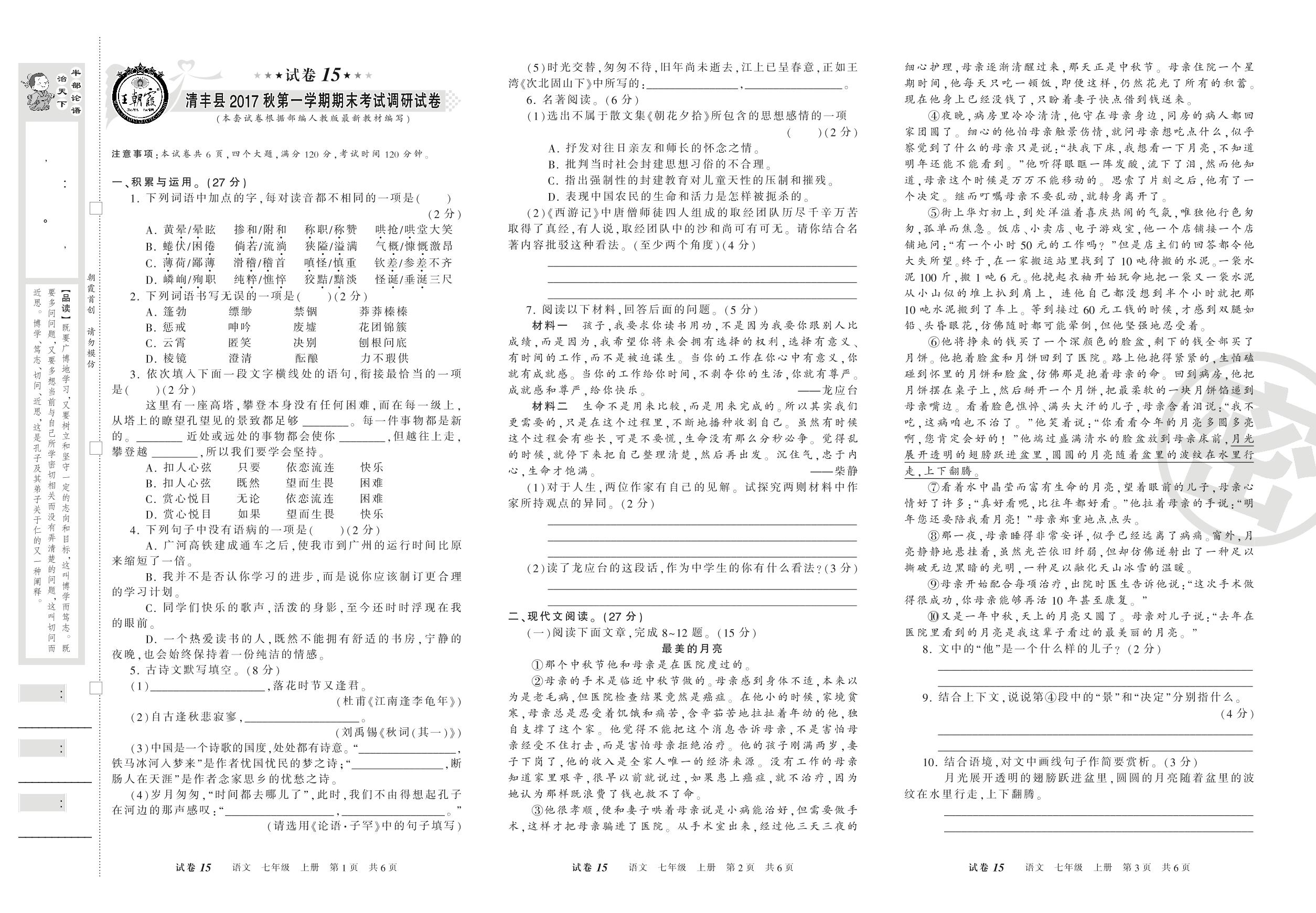 2016-2017学年第一学期濮阳市清丰县七年级语文试卷(人教版)【15】