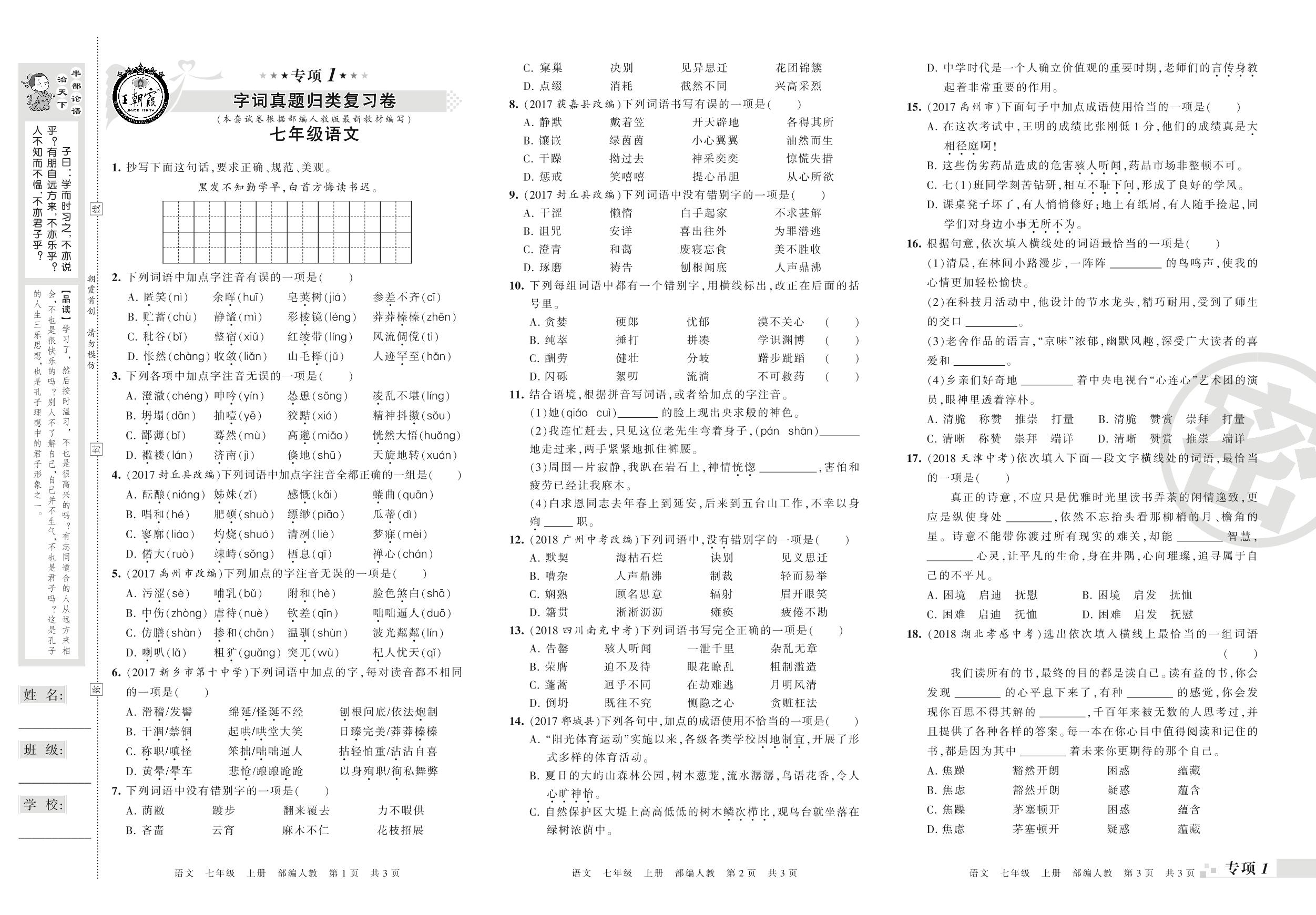 王朝霞期末专项卷——字词、句子真题归类复习卷七年级上册语文(人教版)_R210802160859【0】