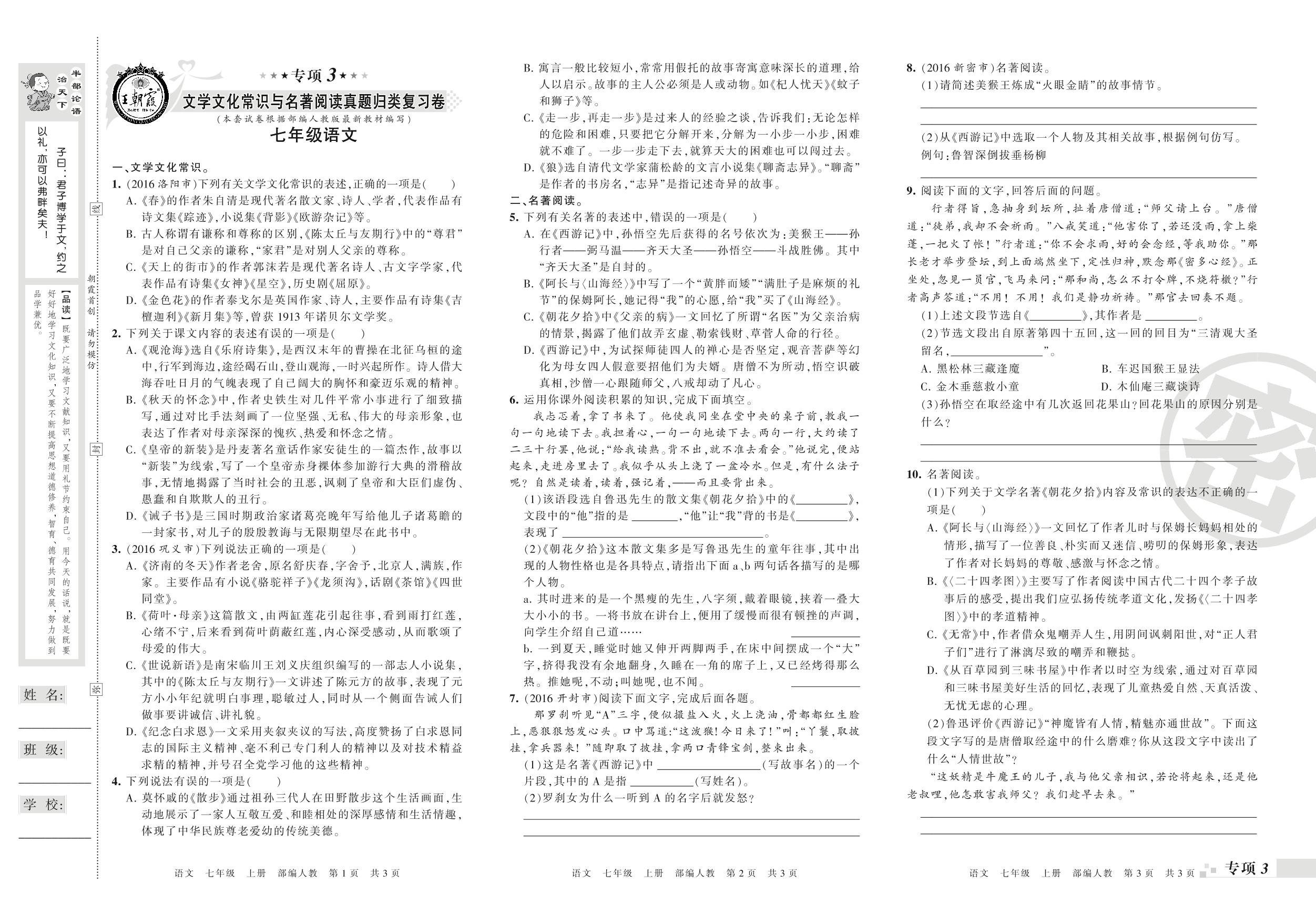 王朝霞期末专项卷——文学文化常识与名著阅读、综合性学习真题归类复习卷七年级上册语文(人教版)_R210802160915【0】