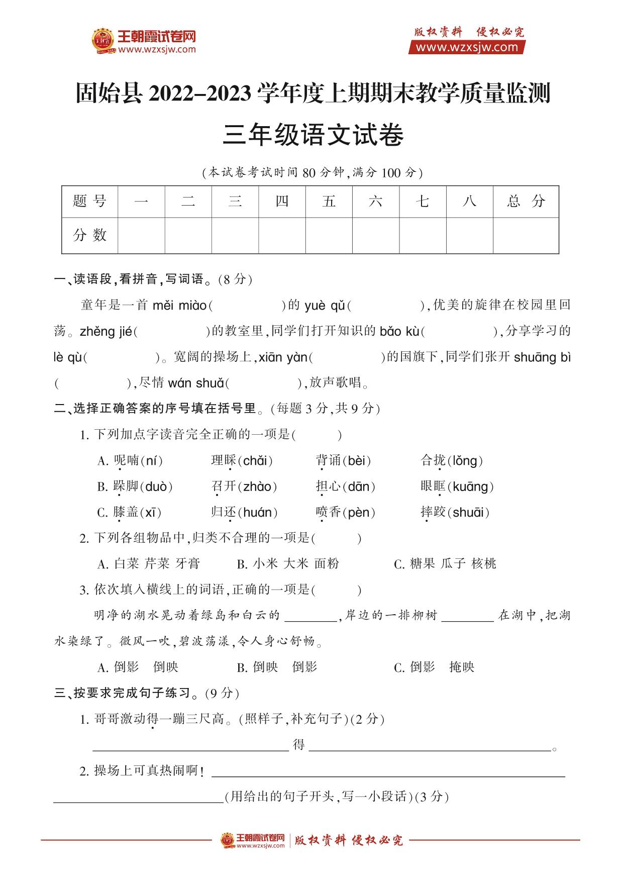 河南省信阳市固始县2022-2023学年度上期末考试试卷三年级语文(人教版)