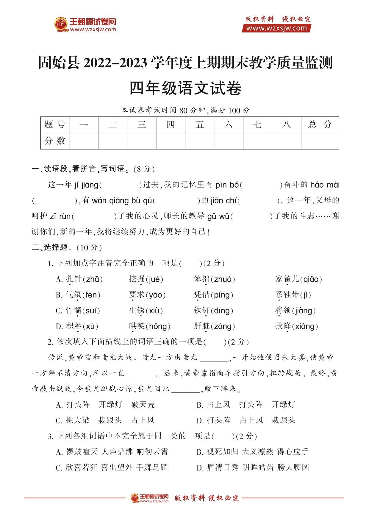 河南省信阳市固始县2022-2023学年度上期末考试试卷四年级语文(人教版)