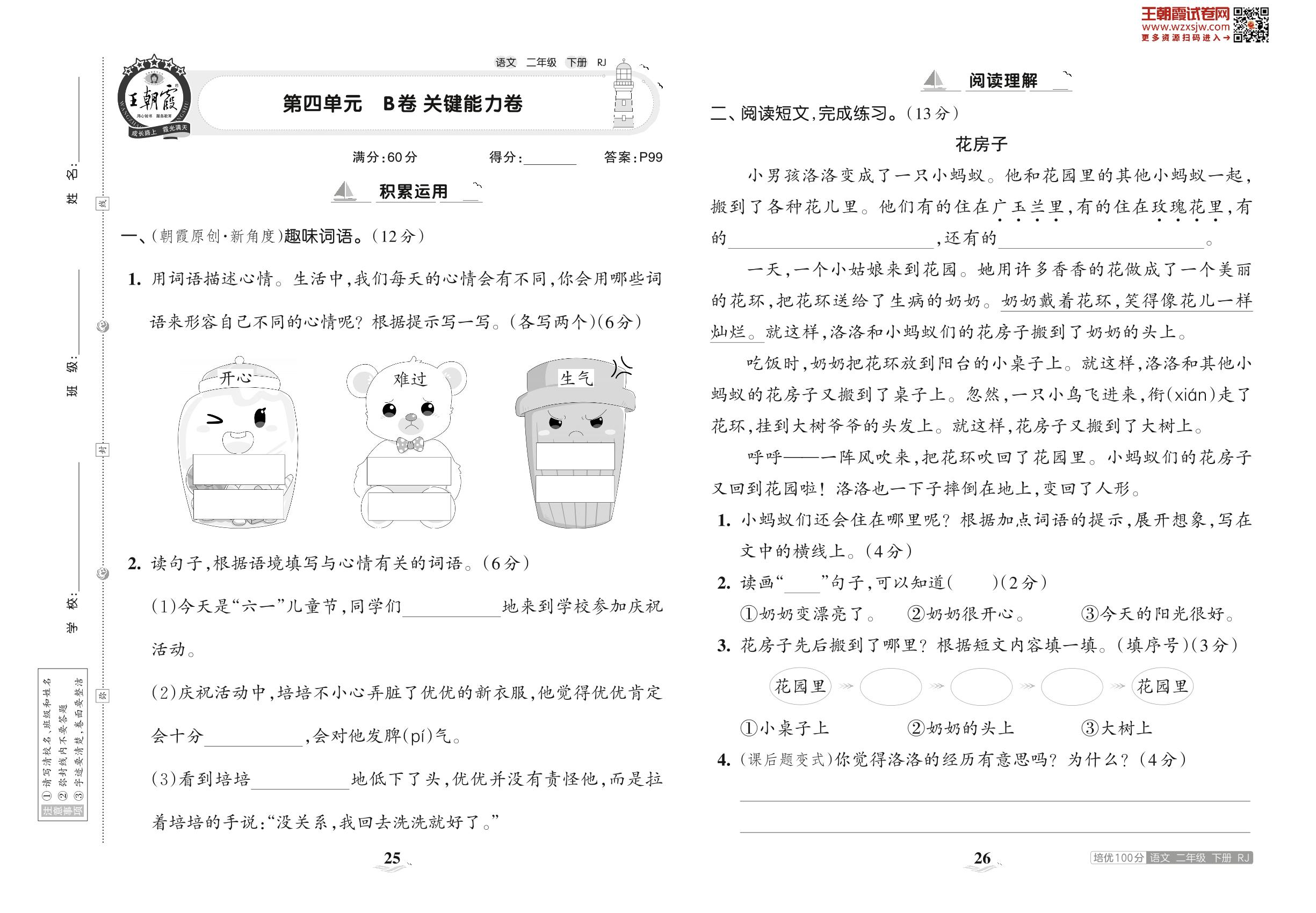 2023下册二年级语文人教版 第四单元 B卷 关键能力卷