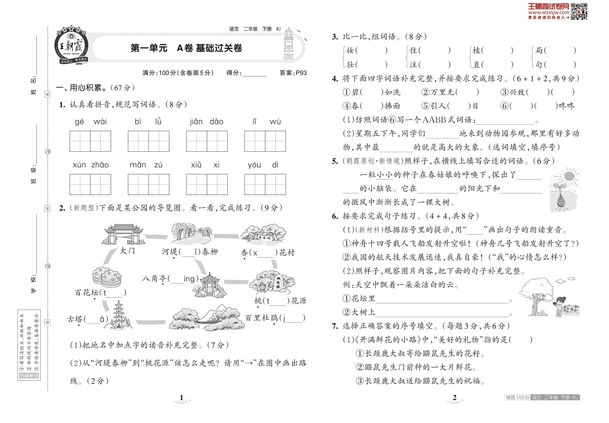 2023下册二年级语文人教版 第一单元 A卷 基础过关卷