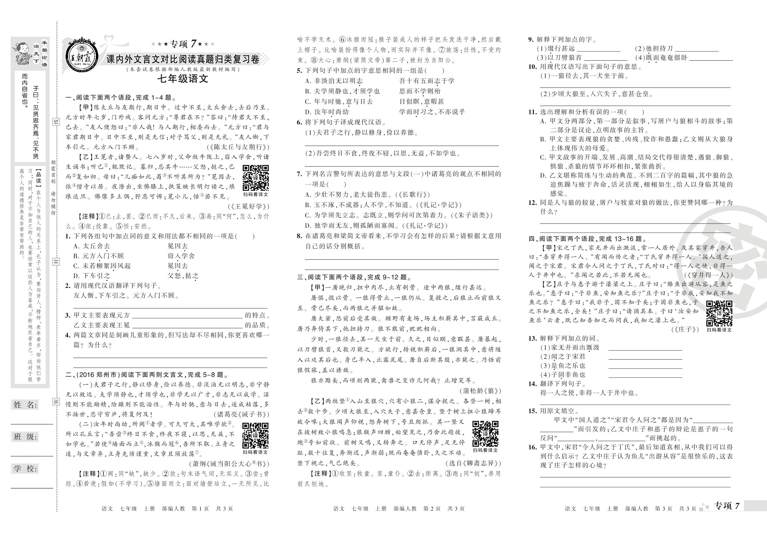 王朝霞期末专项卷——课内外文言文对比阅读、古诗词阅读真题归类复习卷七年级上册语文(人教版)_R210802160956【0】