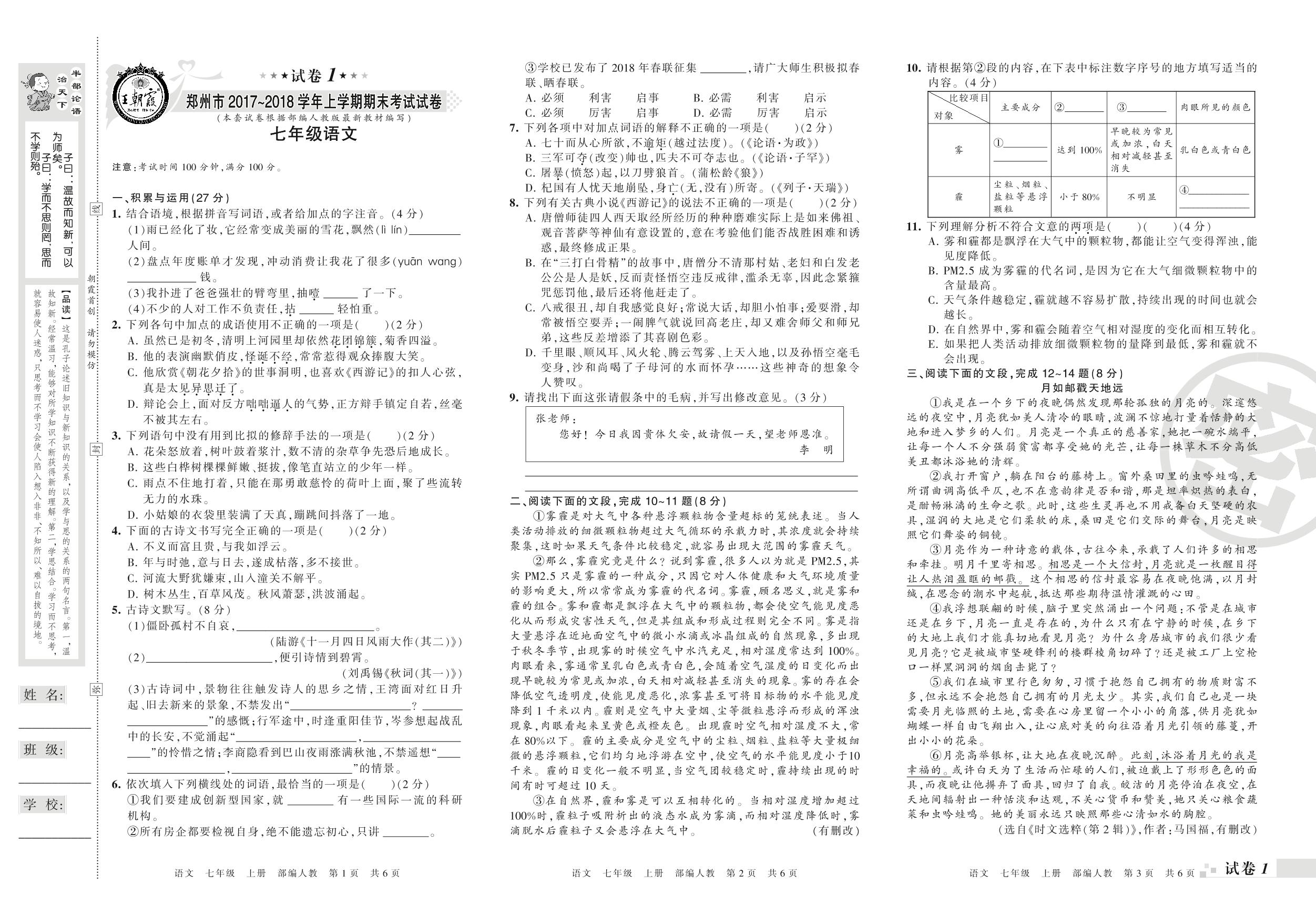 2017-2018学年第一学期郑州市七年级语文试卷(人教版)_R210802161017【1】