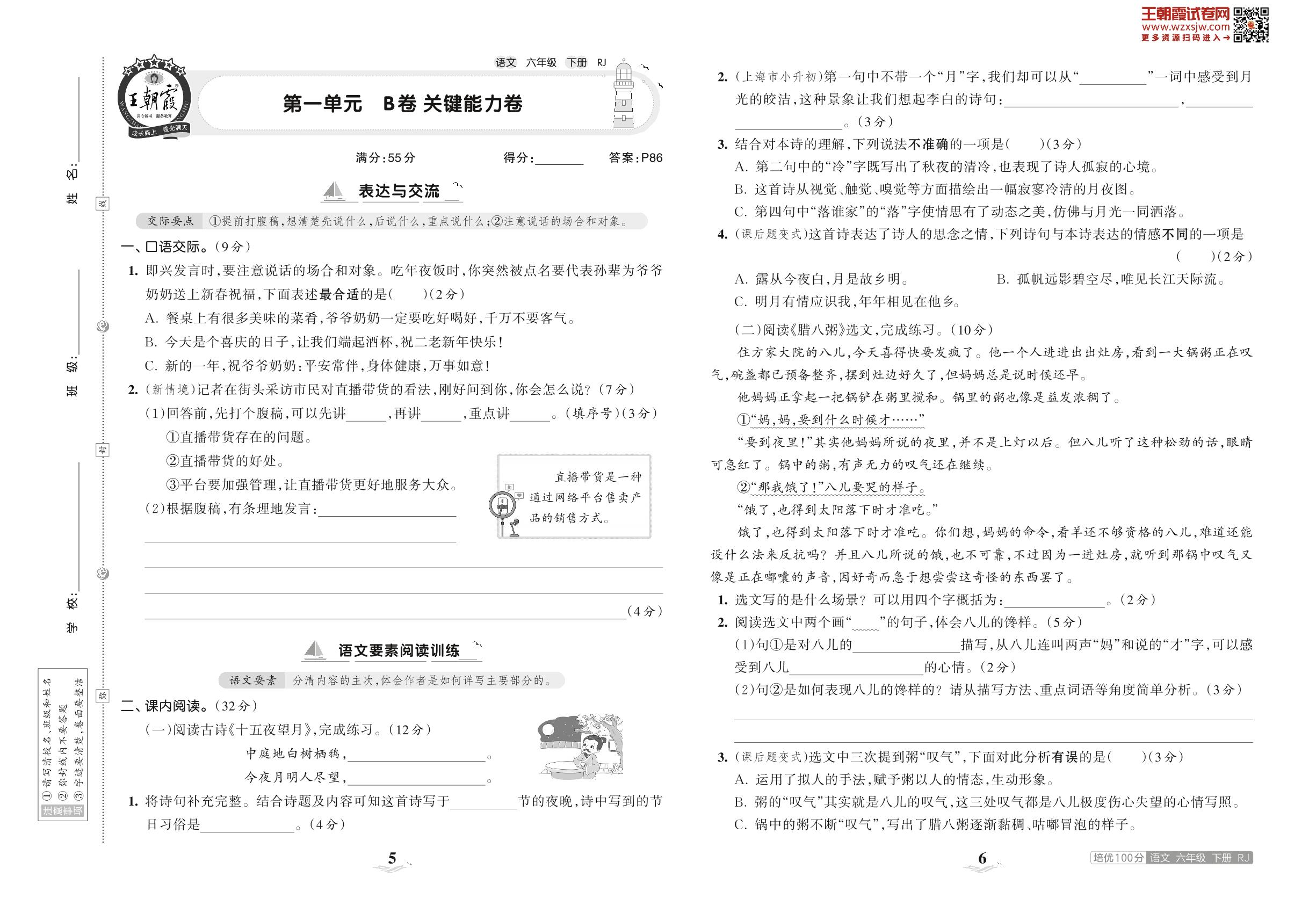 2023下册六年级语文人教版 第一单元 B卷 关键能力卷