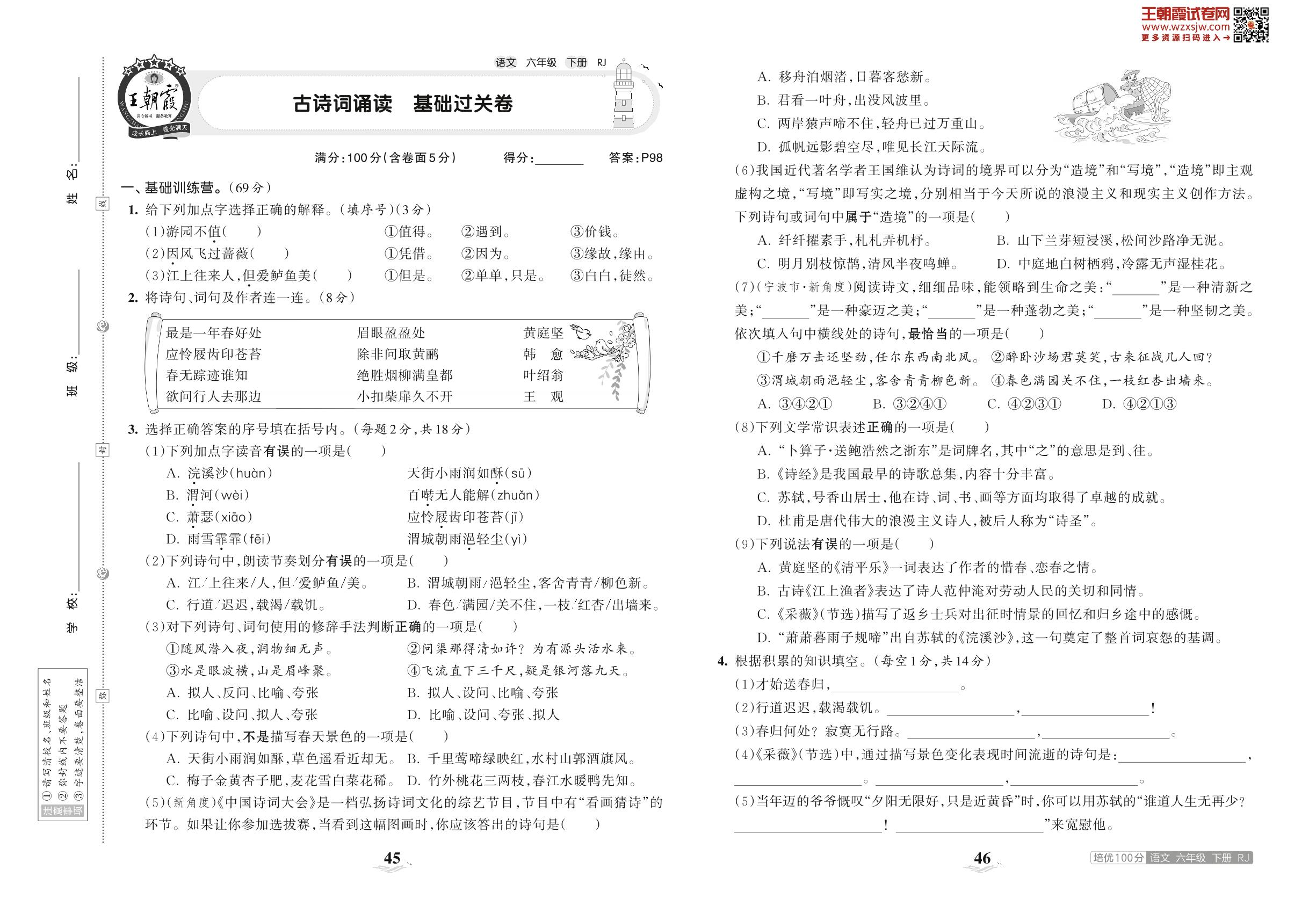2023下册六年级语文人教版 古诗词诵读 基础过关卷