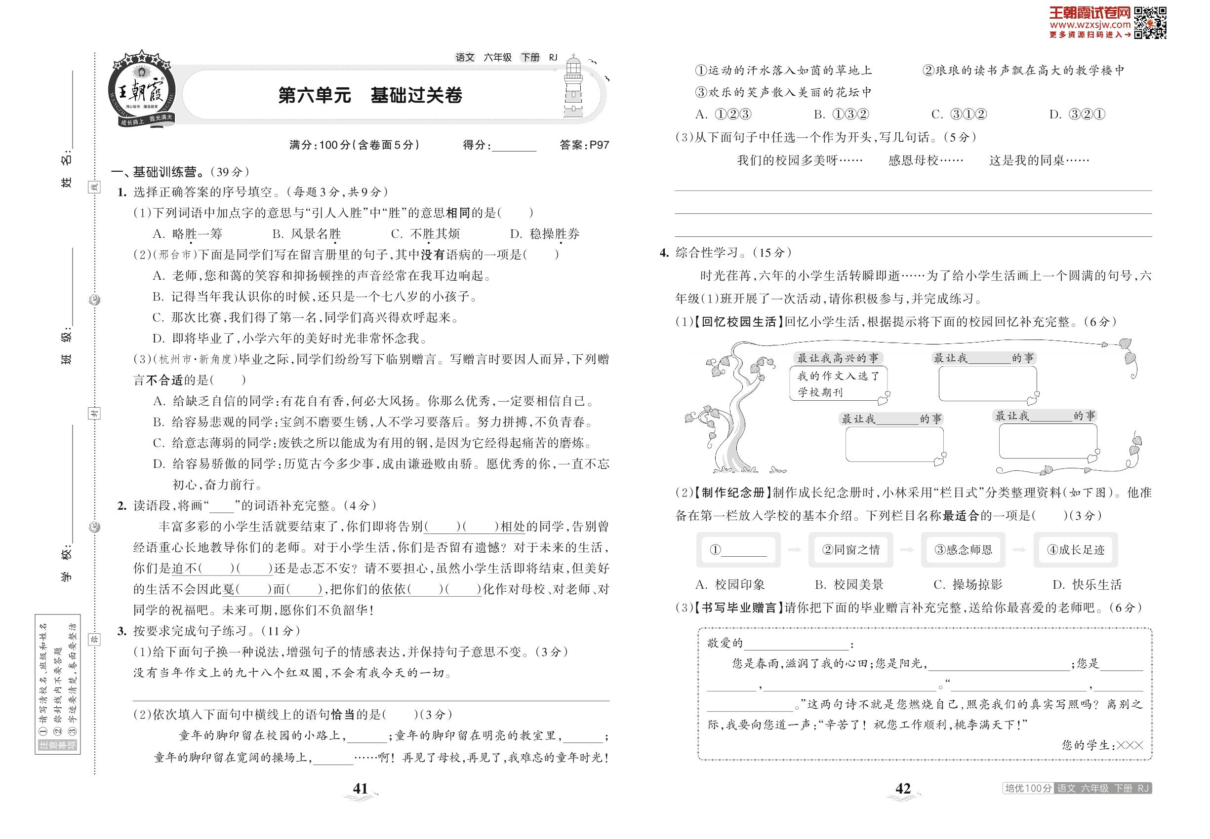 2023下册六年级语文人教版 第六单元 基础过关卷