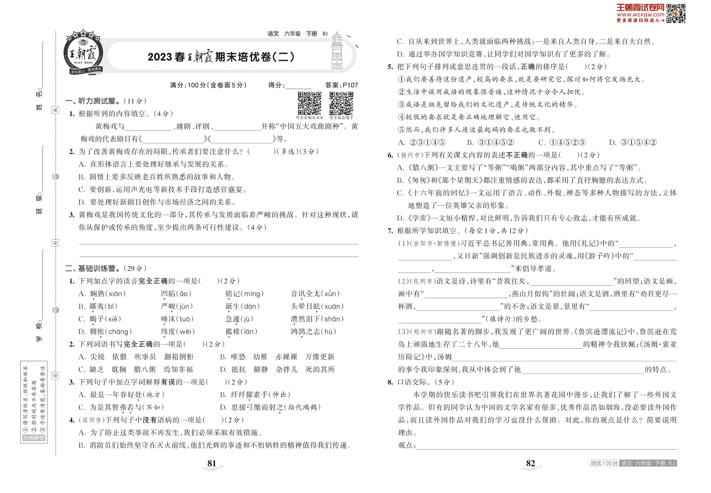 2023下册六年级语文人教版 2023春王朝霞期末培优卷(二)
